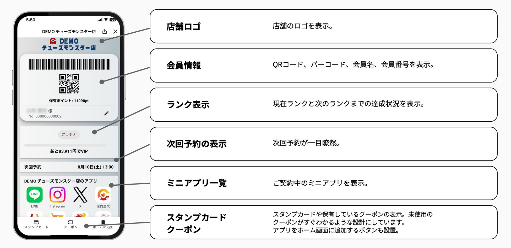 会員証やモバイルオーダー、予約受付などのサービスをアプリの追加ダウンロード・会員登録不要で「LINE」上で提供でき、重要なお知らせを無料で通知することが可能です。