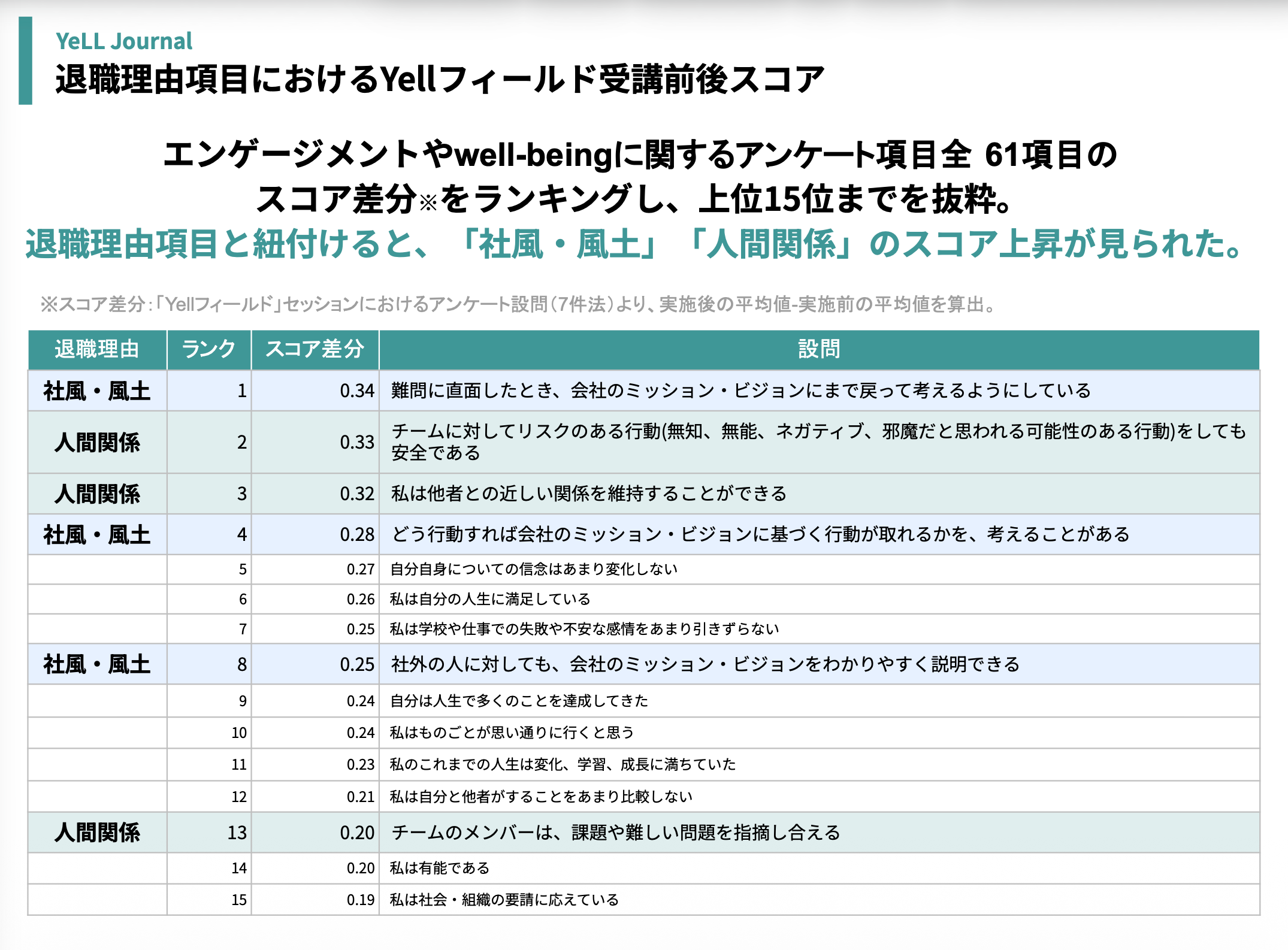 本レポートでは、エール株式会社が提供する社外1on1研修「YeLLフィールド」の受講者2,306名を対象に、受講前後のアンケートデータを分析。「自己理解の深化」が、退職理由として多く挙げられる「社風・風土」「人間関係」といった指標にどのような影響を与えるのかについて、エール株式会社取締役の篠田真貴子が考察しています。