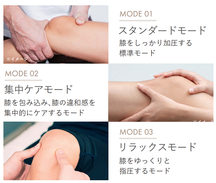 膝をゆっくりと指圧するリラックスモード の3種類からお好みでお選びいただけます。