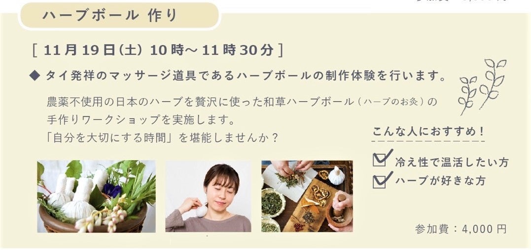 農薬不使用の日本のハーブを贅沢に使った和草ハーブボール(ハーブのお灸)の手作りワークショップを実施します。
