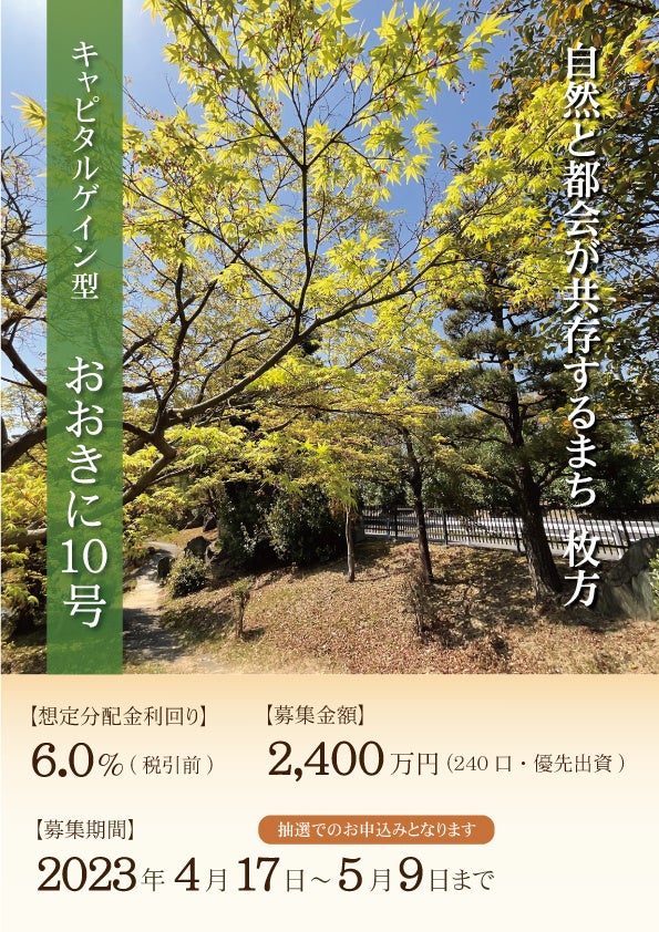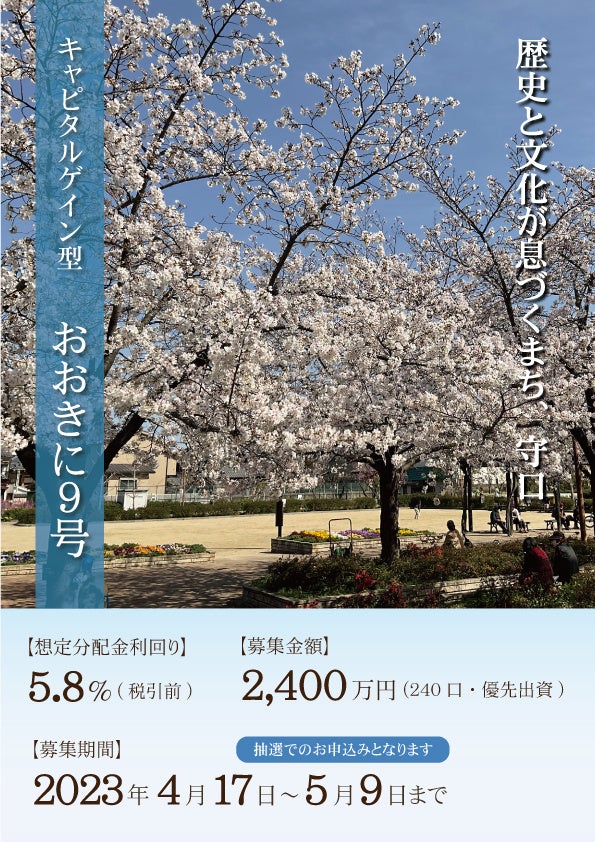 2023年4月17日募集開始の『おおきに9号』について、同日募集の『おおきに10号』とともに、4月11日 HPにて情報公開し、4月12日より既存出資者様及び資料請求をいただきましたお客様へパンフレットを発送いたしました。