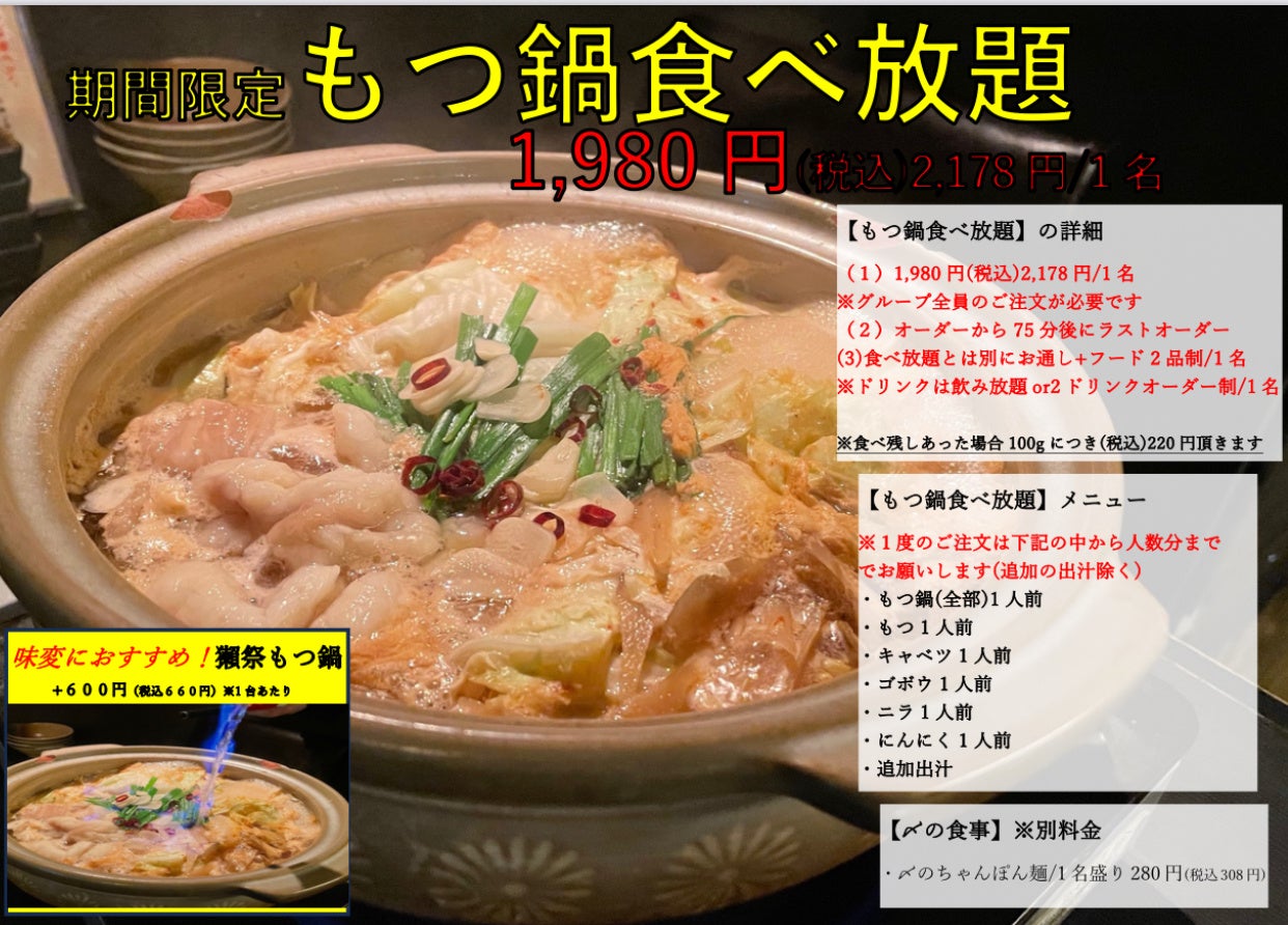 夢酒&富士喜商店全店舗でもつ鍋食べ放題開始!!