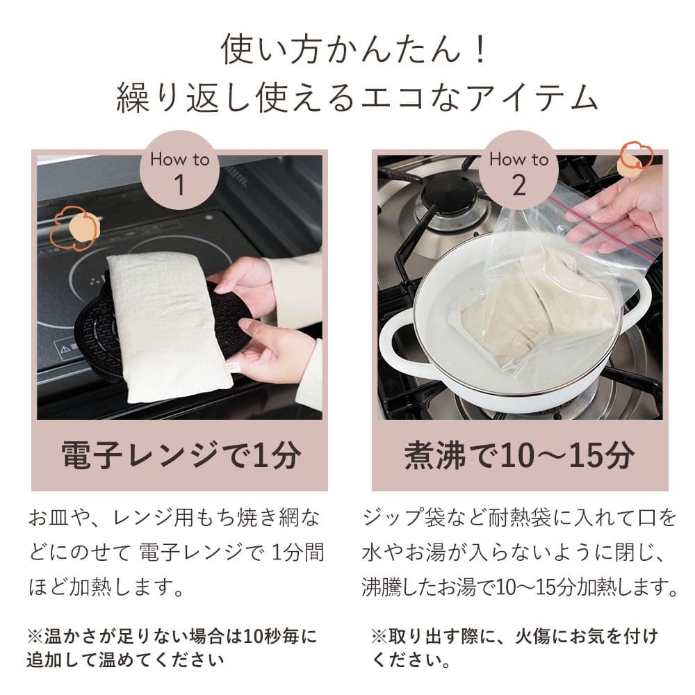 使い方はとても簡単。電子レンジで1分温めるだけで、すぐに使用可能です。玄米の自然な香りが心を落ち着かせ、深いリラックス感をもたらします。エコフレンドリーな素材を使用しているため、環境にも優しい製品です。