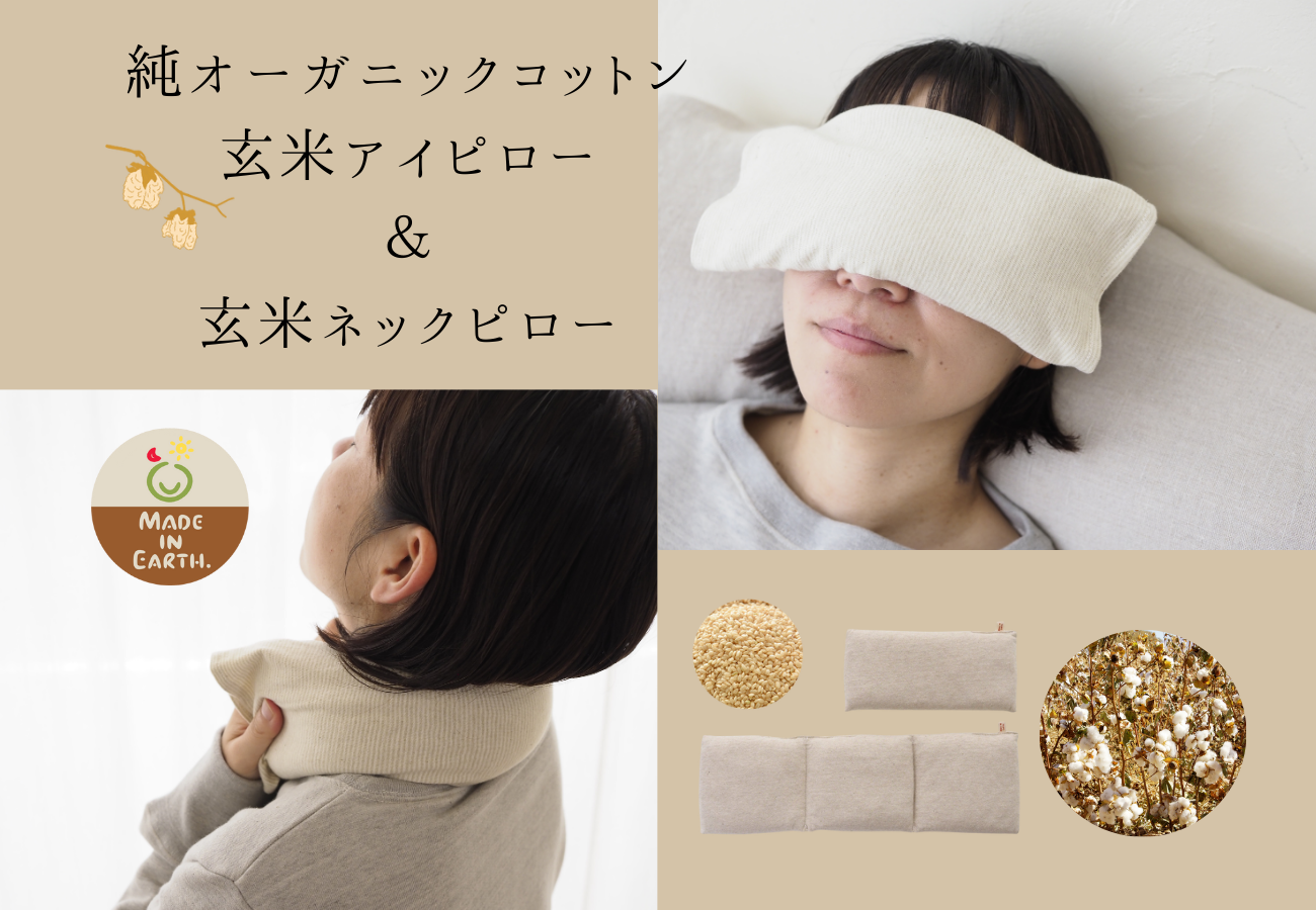 【お風呂じゃないのに温まる!簡単リラックス】幻の玄米とオーガニック生地で、スマホ疲れの目や首、腰やお腹も癒す「玄米アイピロー・ネックピロー」がオーガニックコットン専門のメイド・イン・アースから新発売!