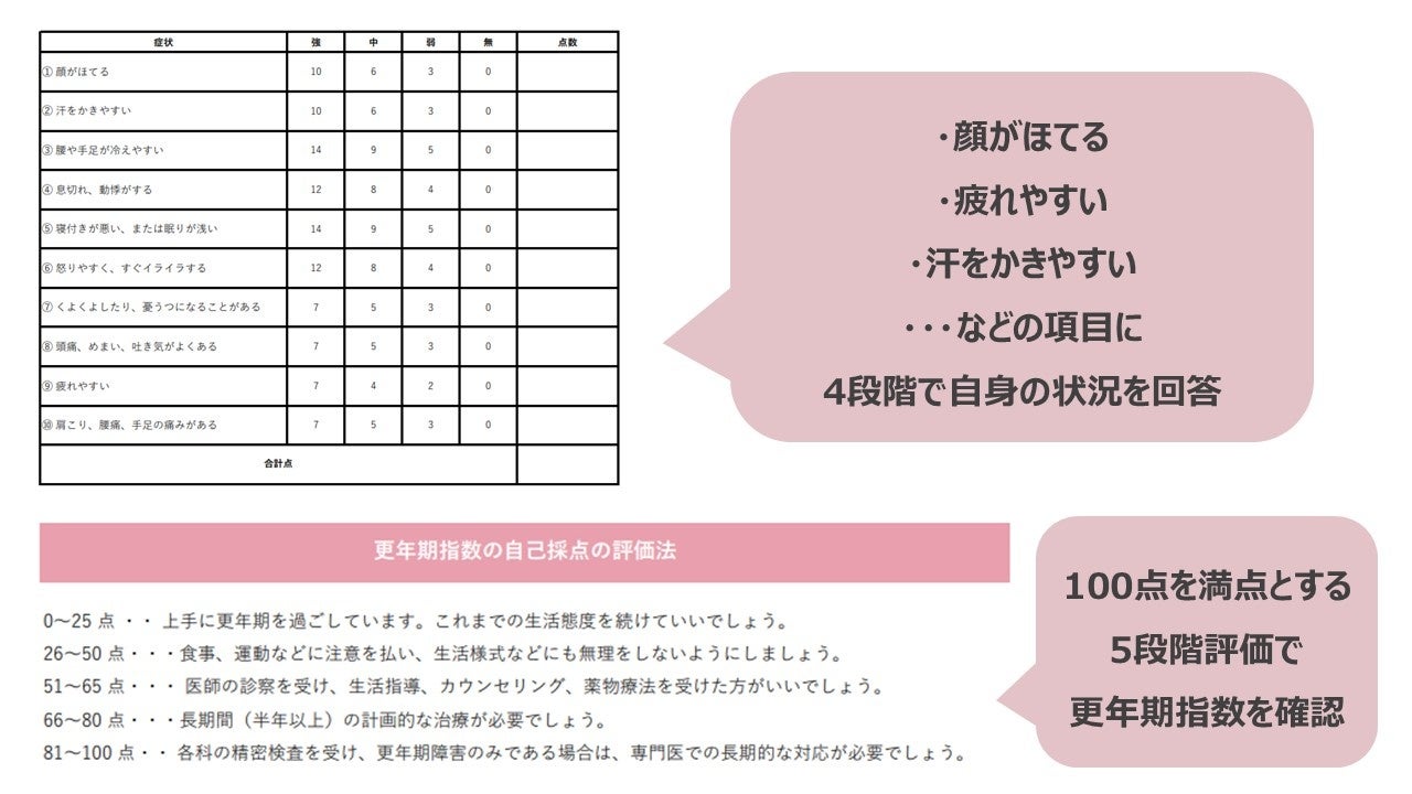 『更年期指数セルフチェックシート※』とは、クレアージュの更年期ドックで実際に使用している問診票の一種です。顔のほてりや疲れやすさなど、自身の症状を4段階で回答し、100点 を満点とする5段階評価で更年期指数を確認することができます。イベント当日は参加者の皆さんにも配布し、ご自身の状態をチェックしていただきました。