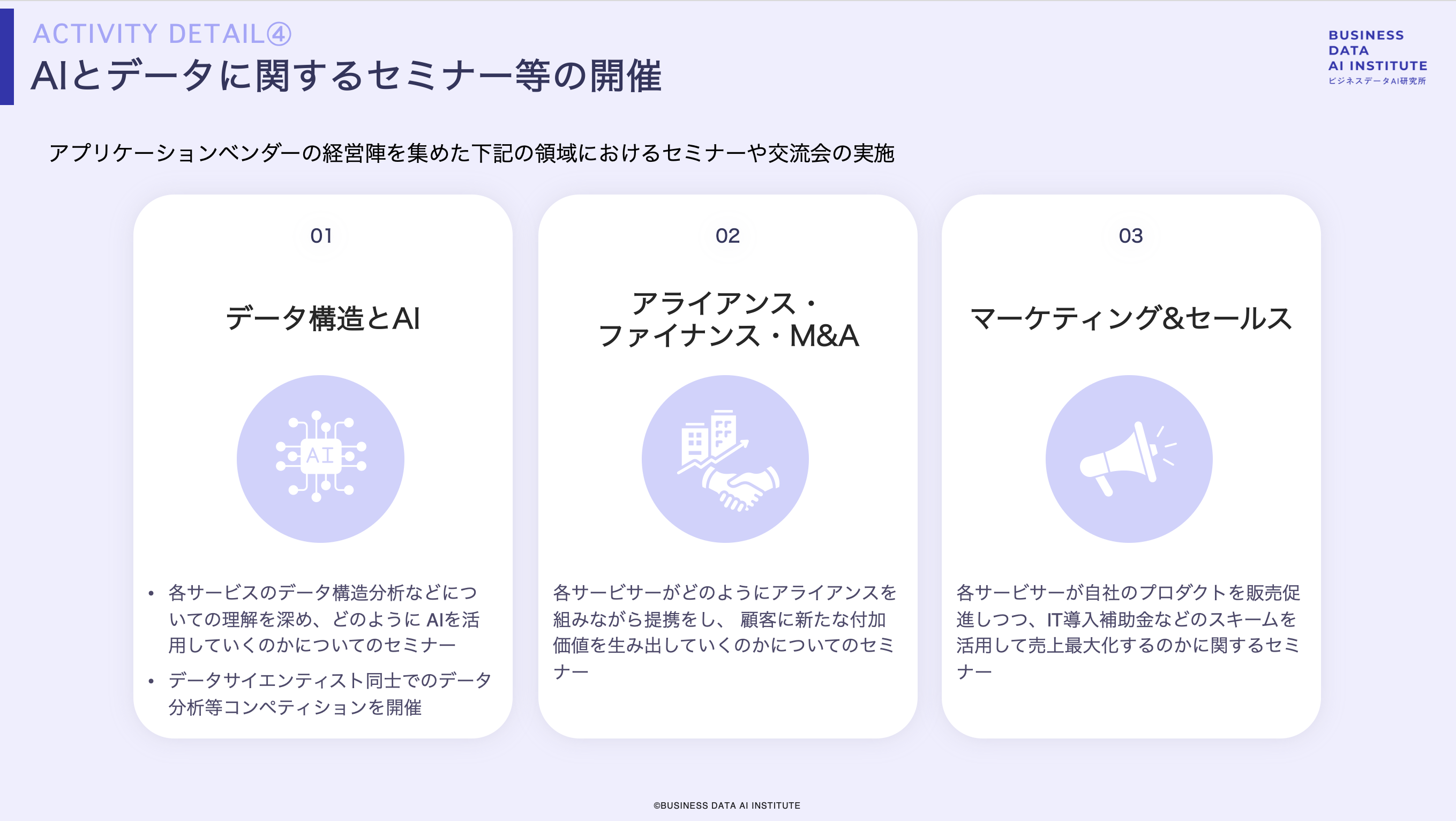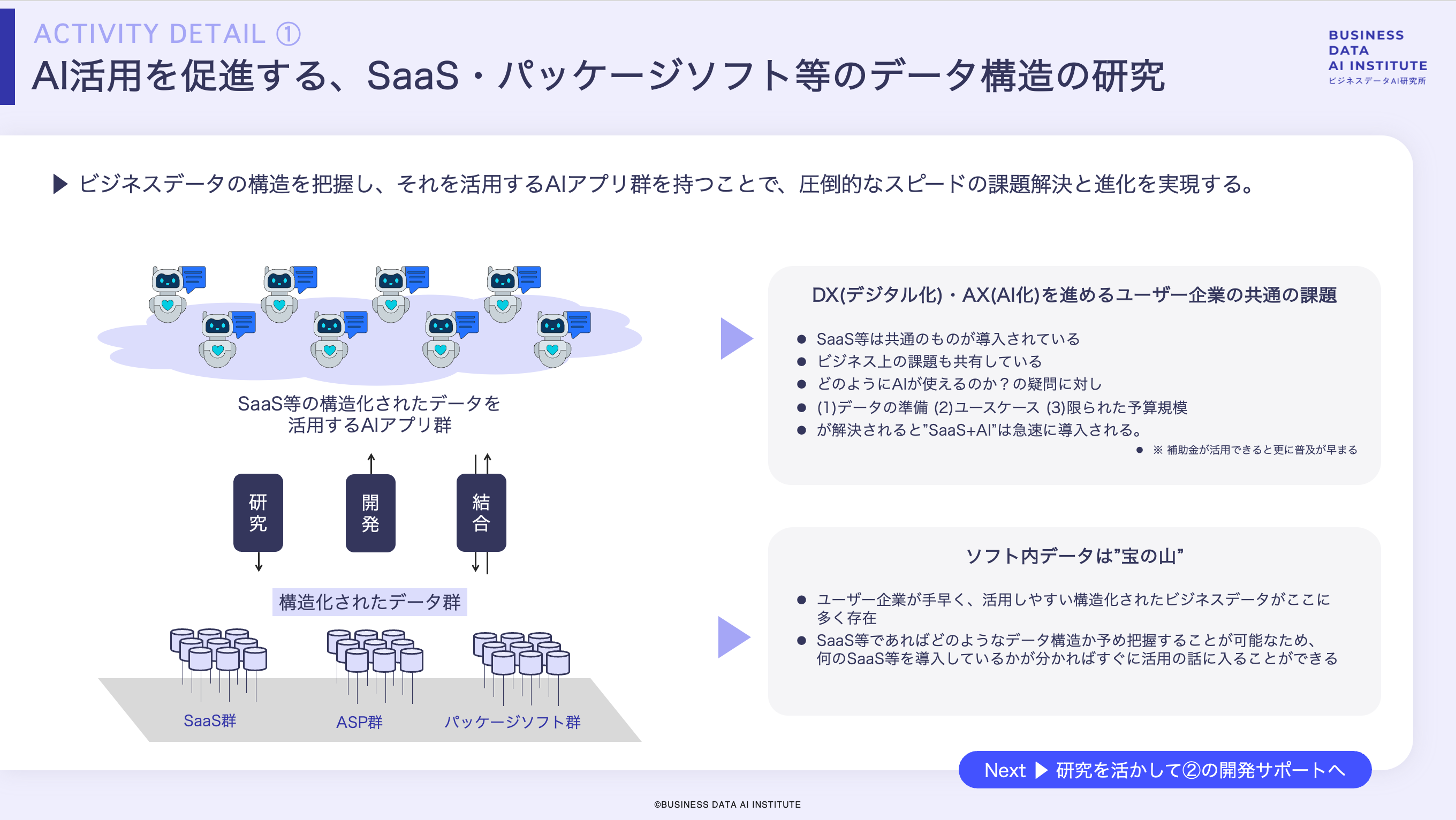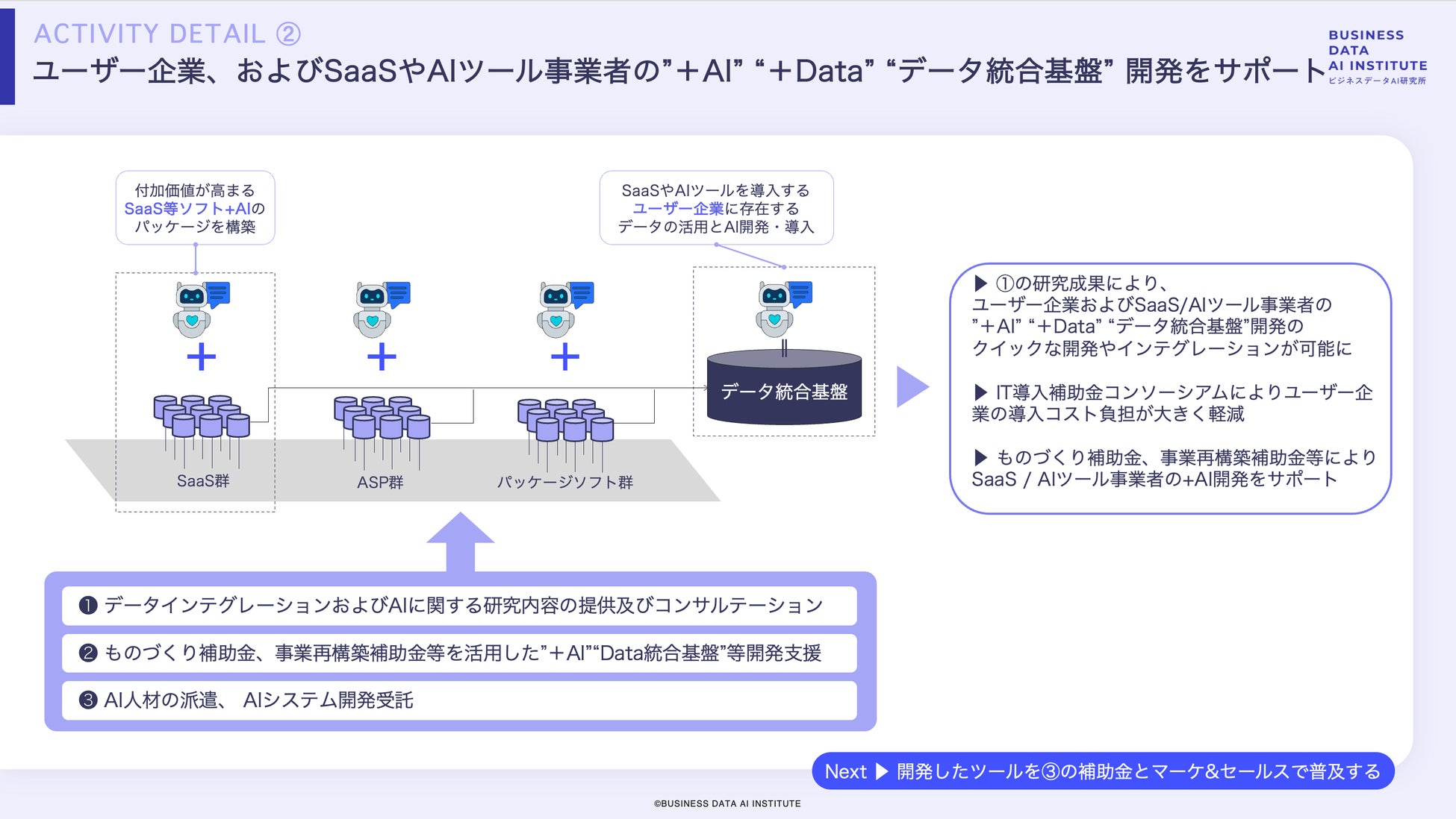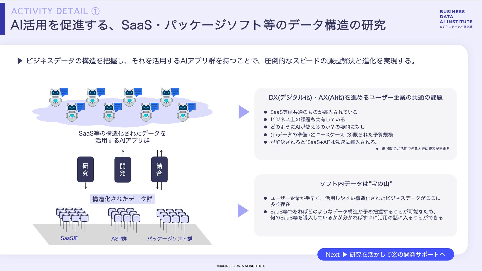 その日本の社会、産業界、企業・団体の進化・移行に寄与するべく、SaaS・ASP・パッケージソフトウェア等の企業に協力いただきながらデータに関する研究等を行い、”+AI”を共に考え、その研究結果をビジネスデータとAIの利用者たる企業に提供することを目的とし、当研究所を設立・運営してまいりたいと考えております。