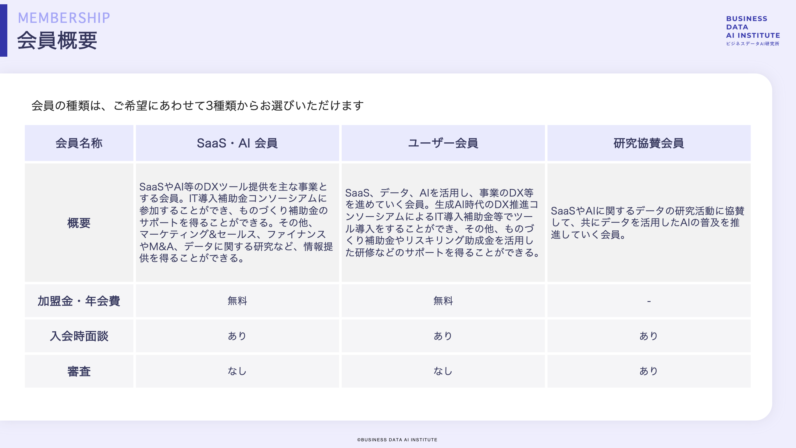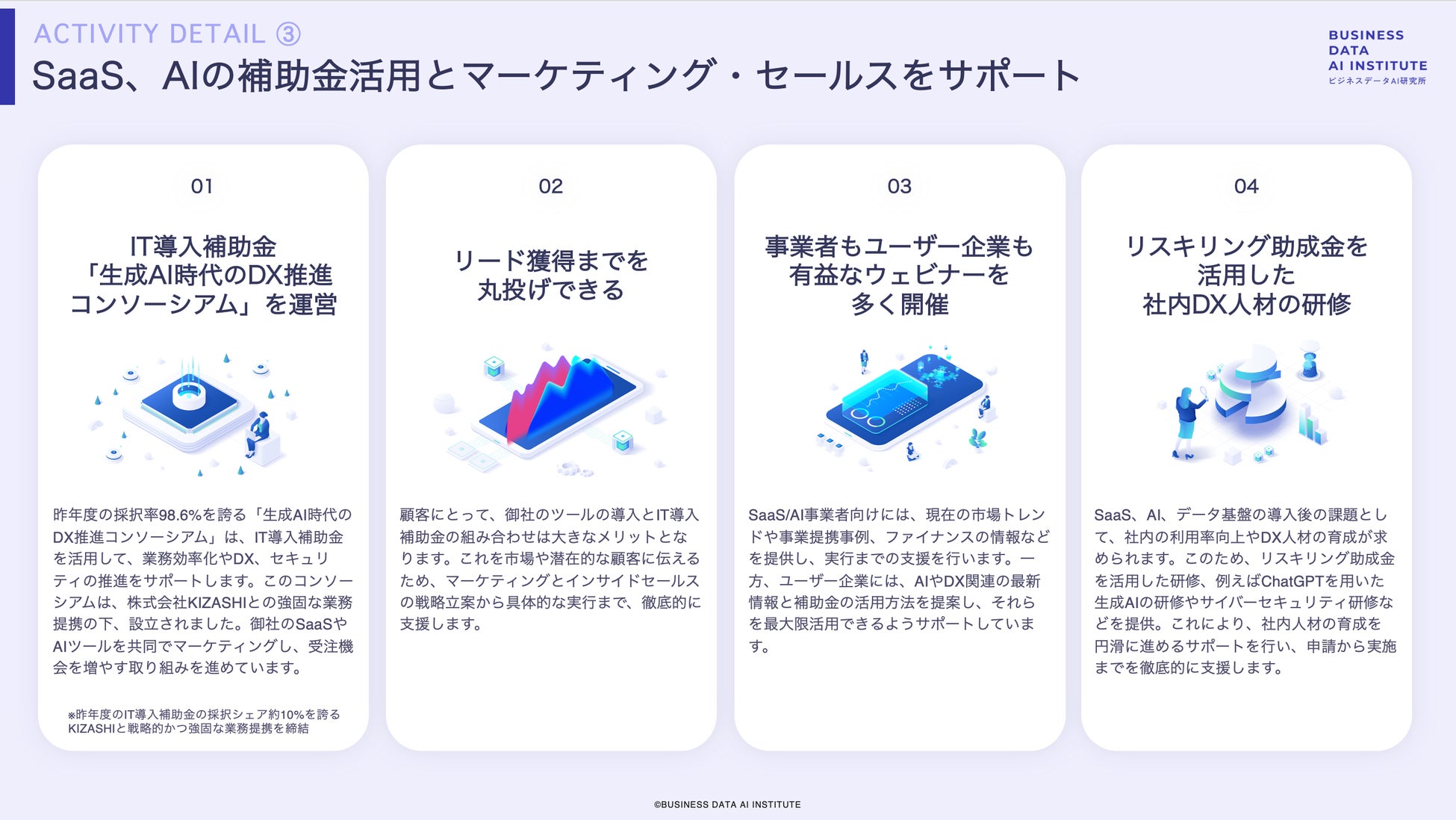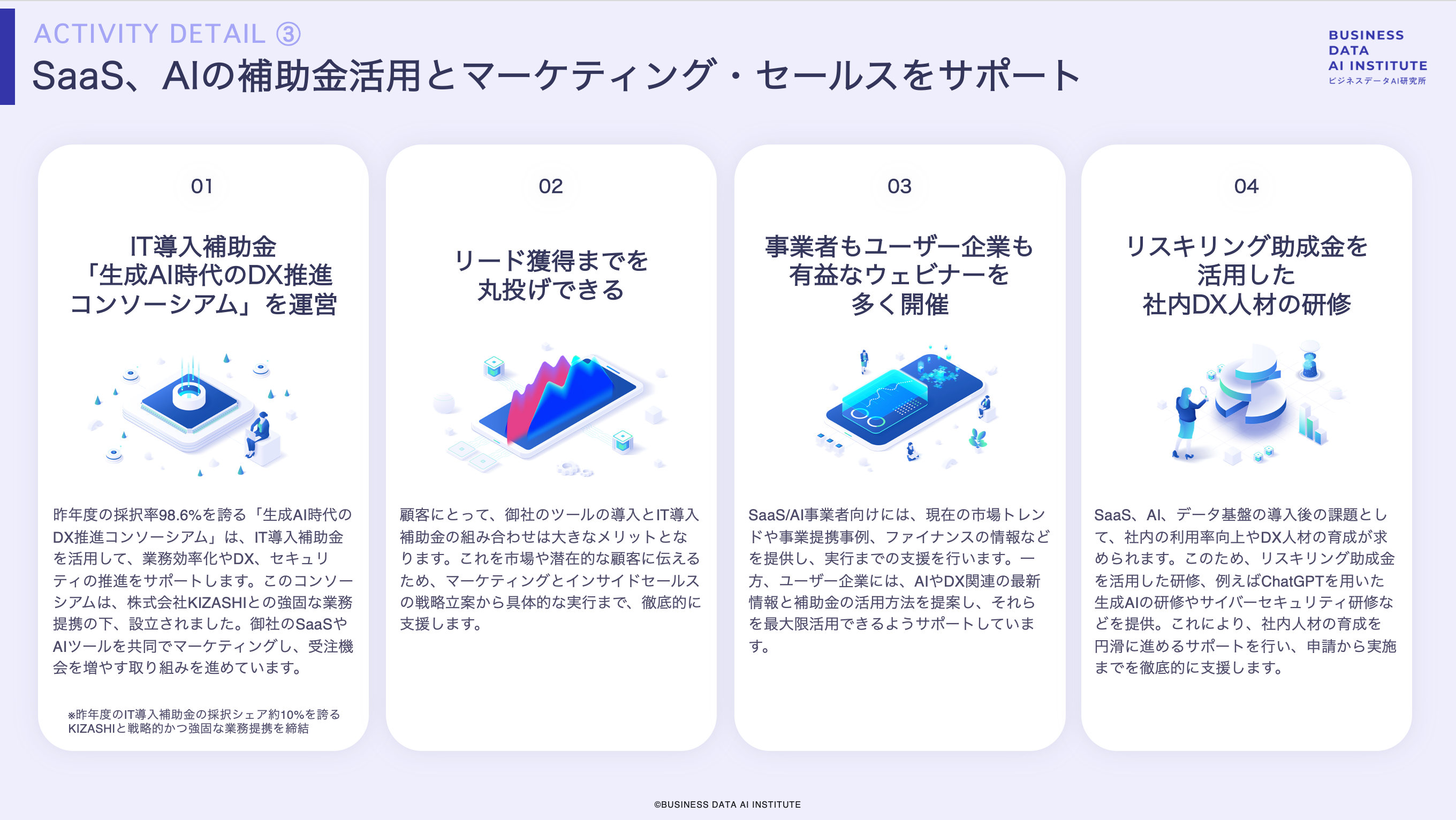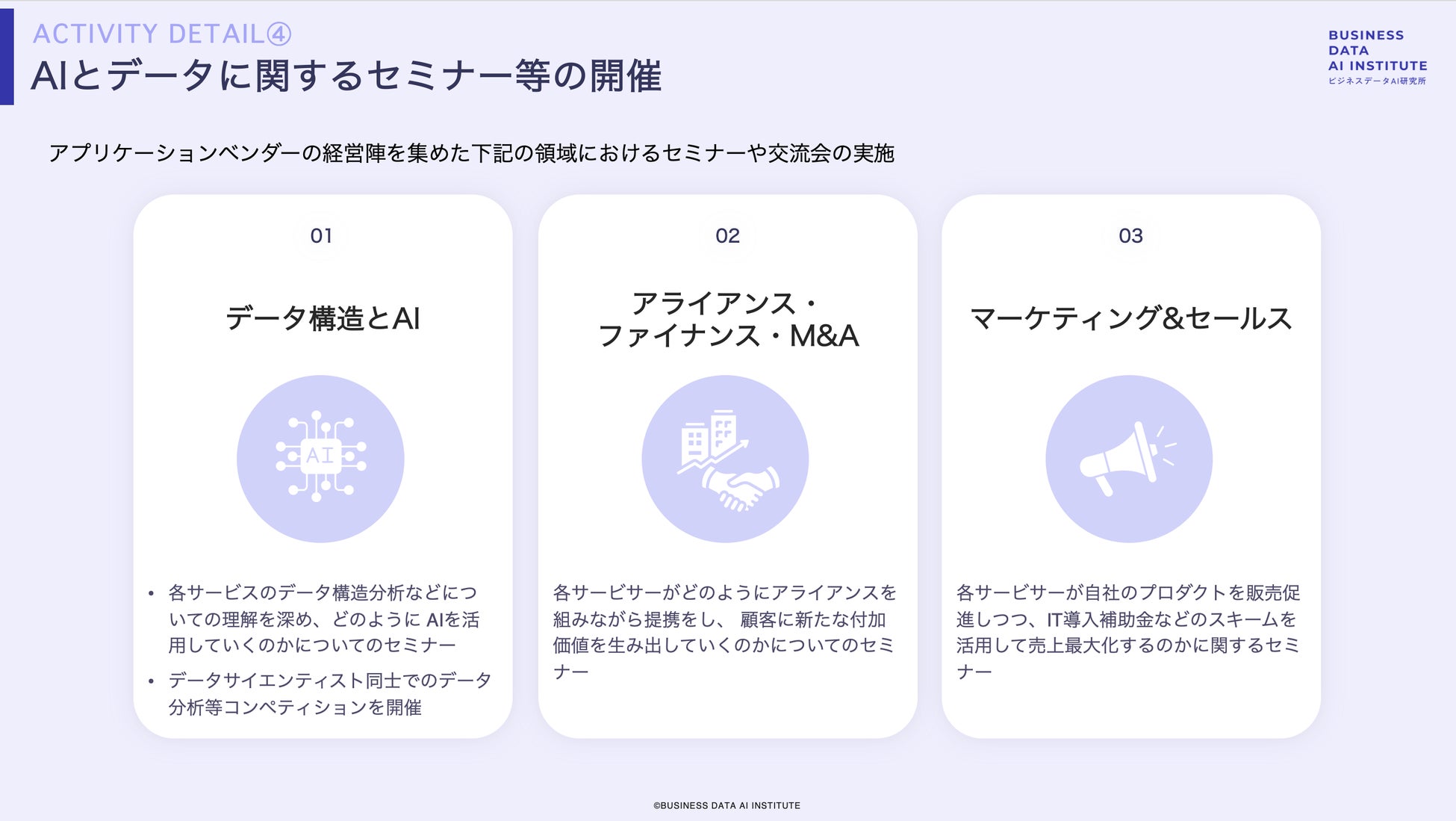 その日本の社会、産業界、企業・団体の進化・移行に寄与するべく、SaaS・ASP・パッケージソフトウェア等の企業に協力いただきながらデータに関する研究等を行い、”+AI”を共に考え、その研究結果をビジネスデータとAIの利用者たる企業に提供することを目的とし、当研究所を設立・運営してまいりたいと考えております。