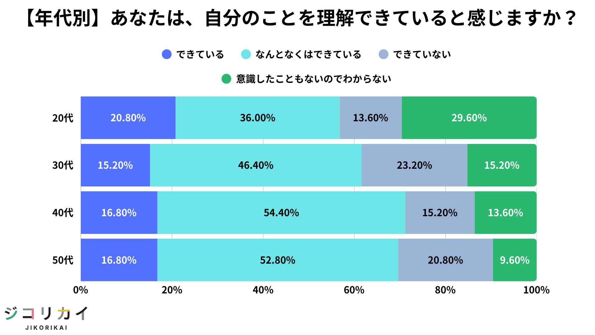 「自己理解できている」と回答した割合を年代別で見ると、20代で20.8%、30代で15.2%、40代で16.8%、50代で16.8%と、年代問わずほぼ横ばいでした。