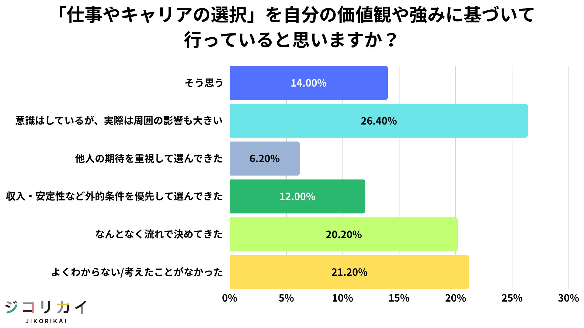 「仕事やキャリアの選択を自分の価値観や強みに基づいて行っていると思いますか?」という質問に「そう思う(常に自分の軸にしたがって意思決定している)」と回答したのは14%でした。