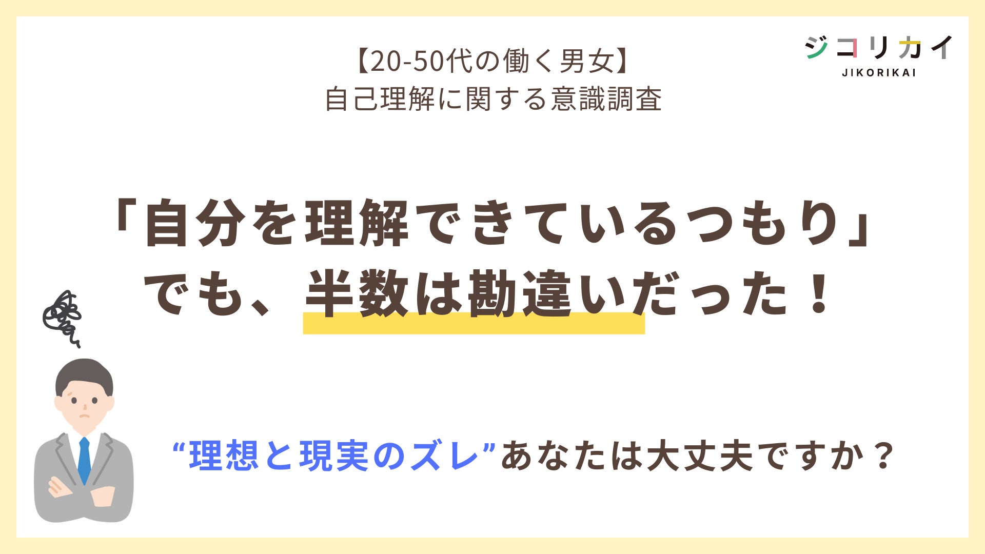支援実績6,500名の心理テクノロジーベンチャー、株式会社ジコリカイ(本社:東京都渋谷区、代表取締役:八木仁平、取締役CEO:阿部和也、以下、当社)は、20〜50代の働く男女を対象に「自己理解に関する意識調査」(n=500)を実施しました。