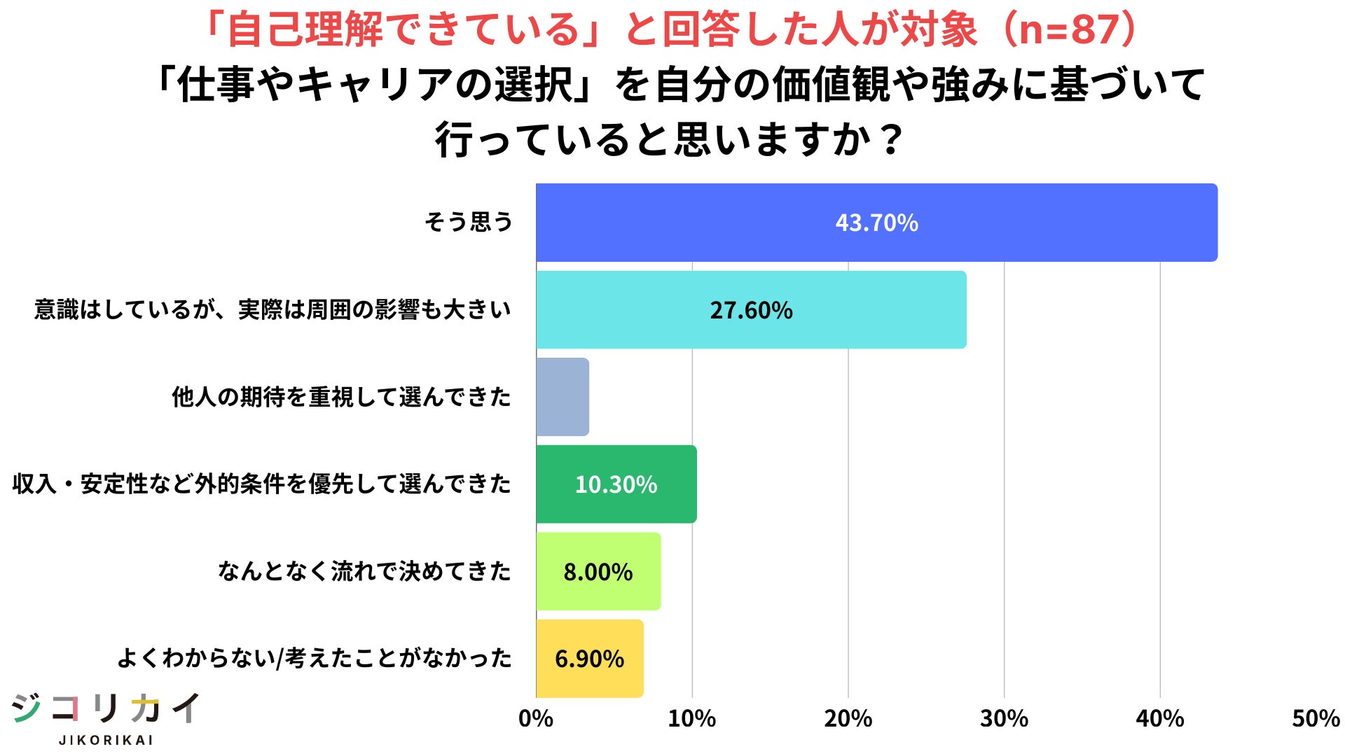「自己理解できている」と回答した87名に限定して分析したところ、「仕事やキャリアの選択を価値観や強みに基づいて行っている人」は43.7%で、半数以下という結果に。自己認識と現実の行動には大きなズレがあることが浮き彫りになりました。
