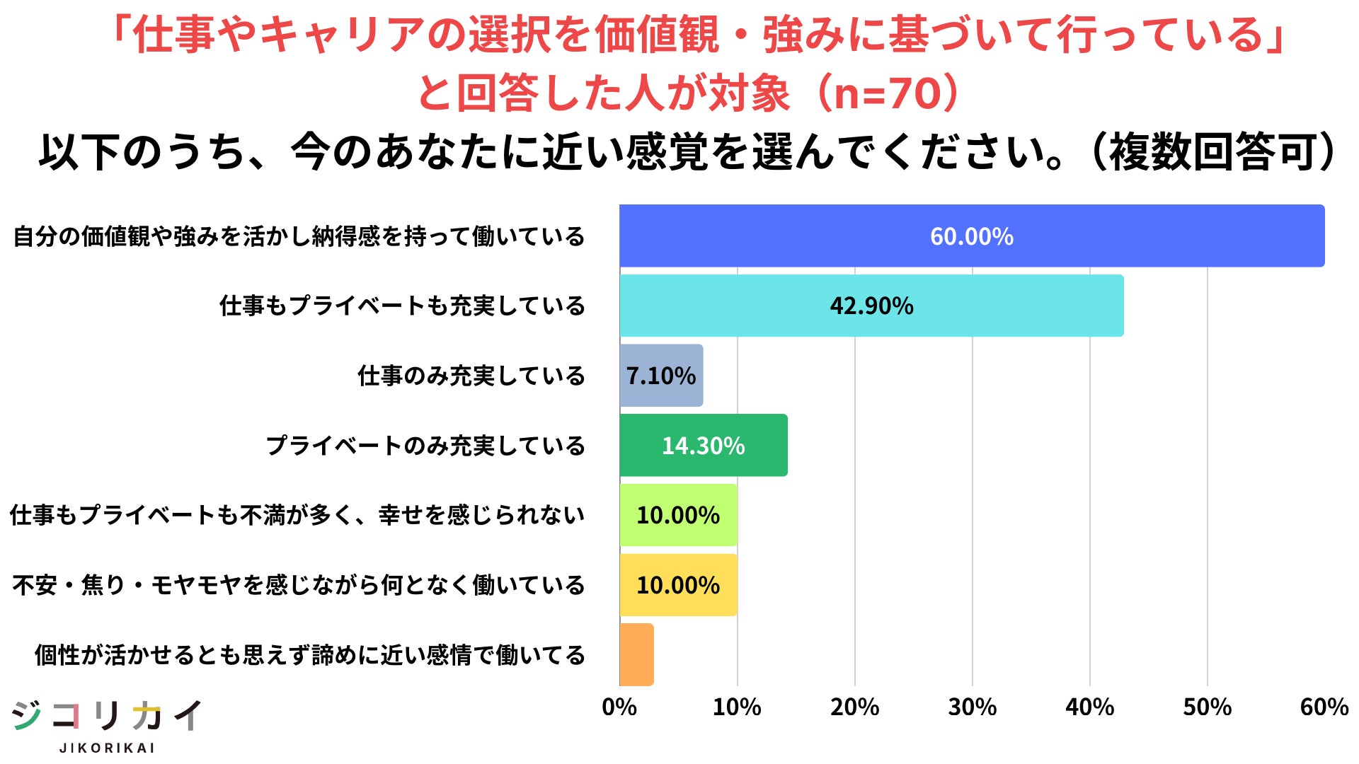 前の質問で「仕事やキャリアの選択を自分の価値観や強みに基づいて行っている(=自分軸にしたがって決断している)」と答えた人は、全体の14%(n=70)にとどまりましたが、その70名に限定して、「今の感覚」を分析したところ、「納得感」や「充実感」「幸福感」に関する回答が、全体平均と比べて著しく高いことがわかりました。