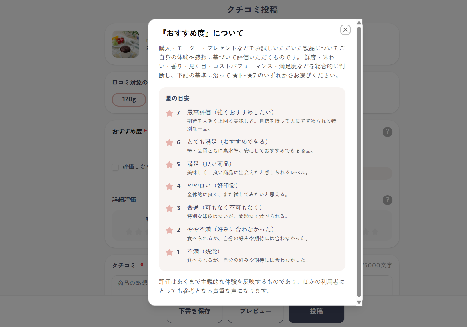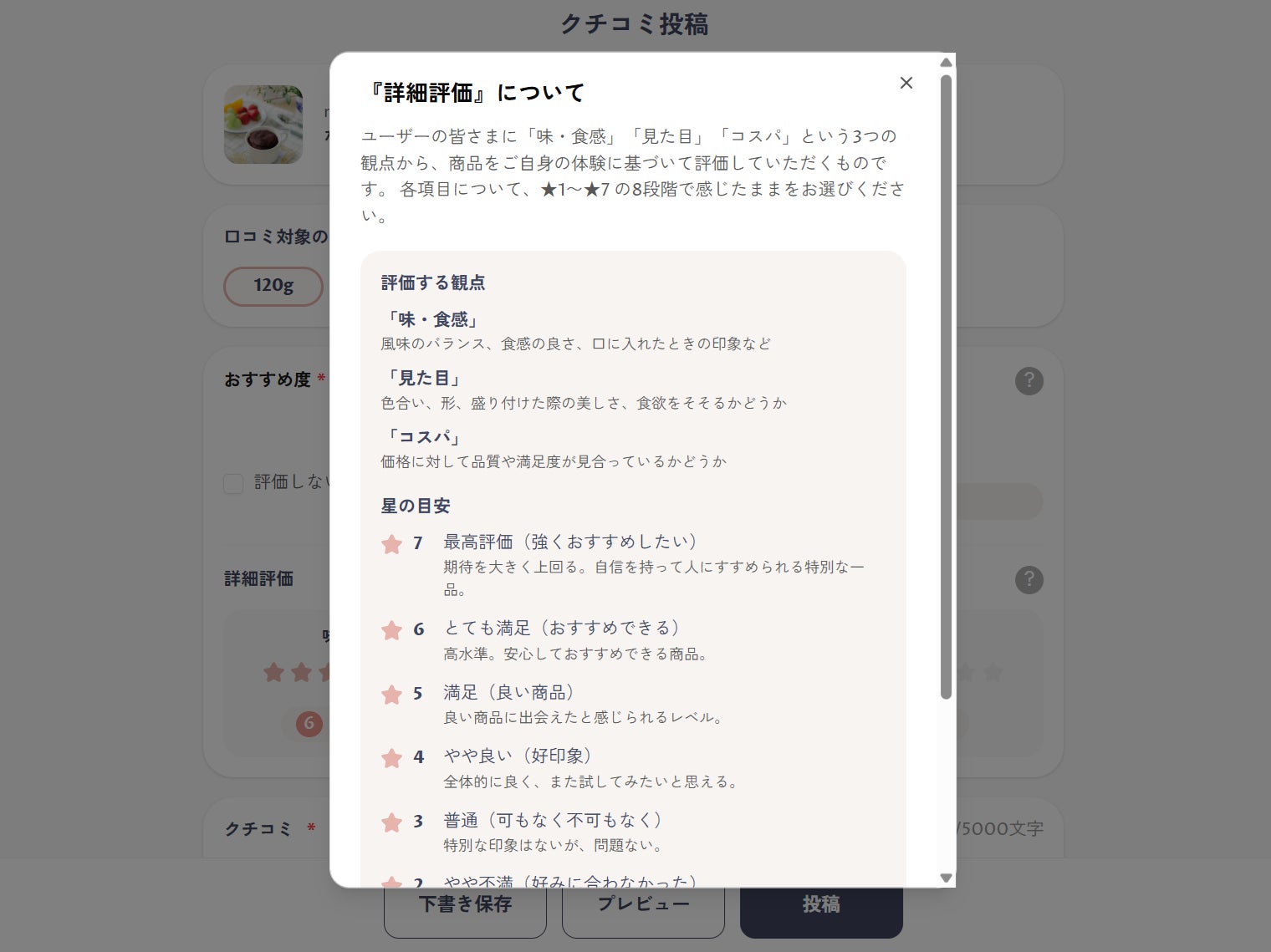 ユーザーは実際に体験した商品に対して、以下の基準で評価を行います。