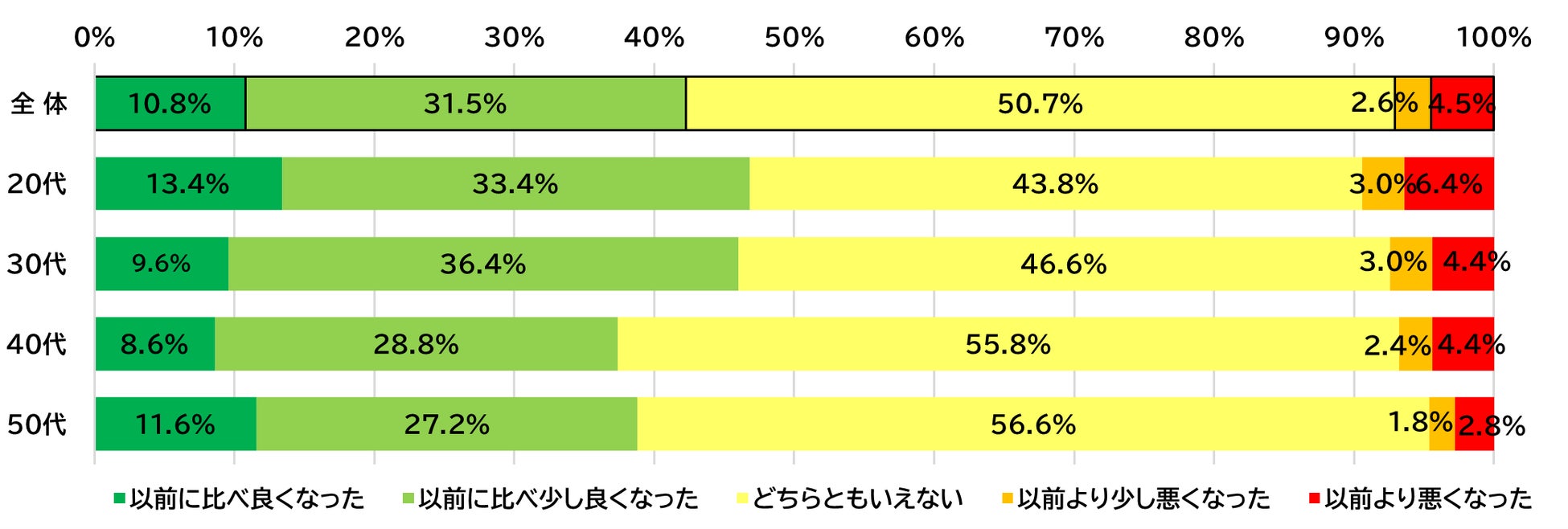 遺伝子組み換え食品についてどのようなイメージを持っているかとの問いに「特に何のイメージも持っていない」と答えた人が最も多く、全体の45%でした。若年層ほど否定的な回答が少なく、20代では「良い」「どちらかといえば良い」(好意的)と「特にイメージなし」(中立的)の合計が約7割を占めています。