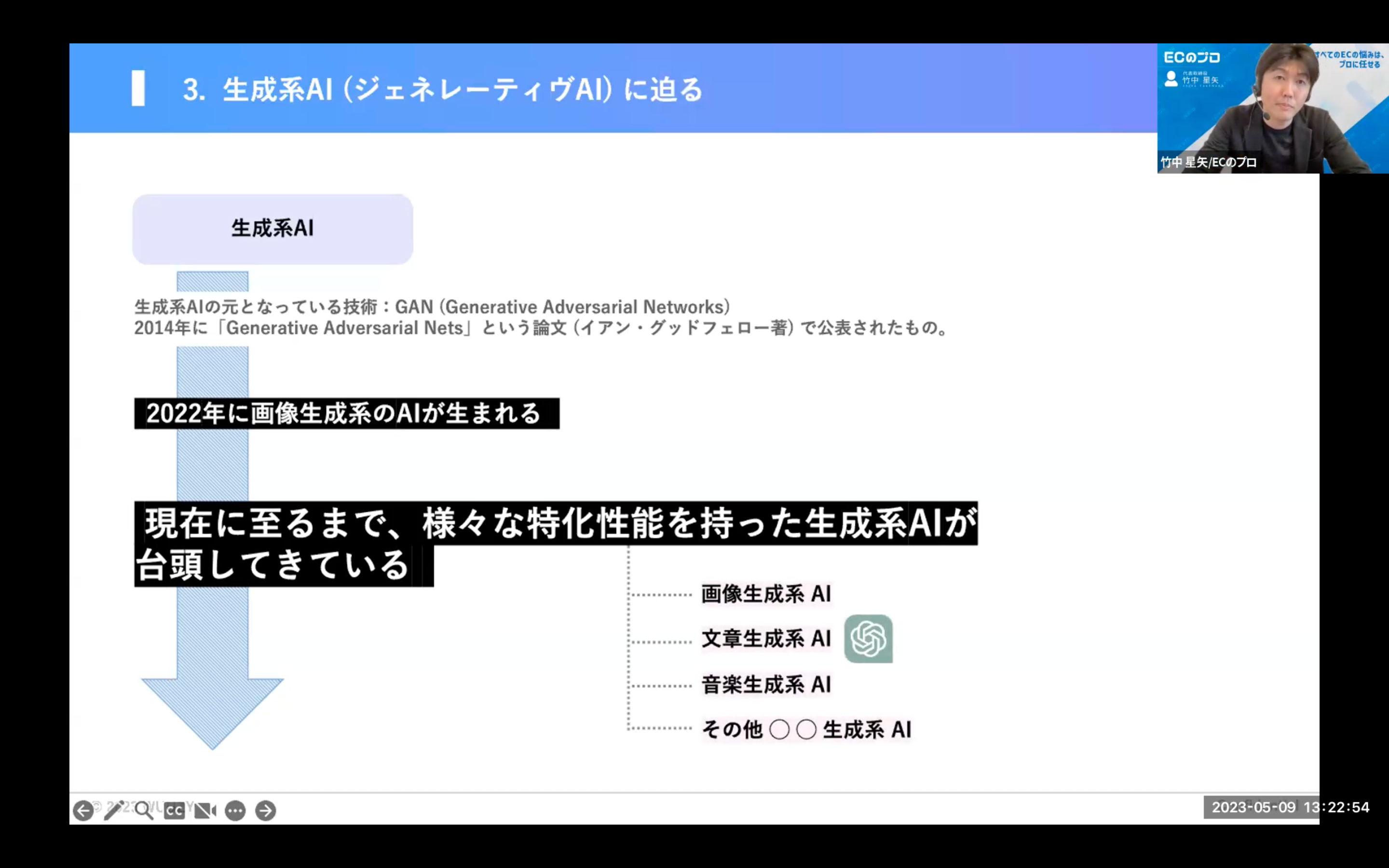 今回のセミナーではEC事業者さま向けに、「生成系AIができること」をメインに解説しました。