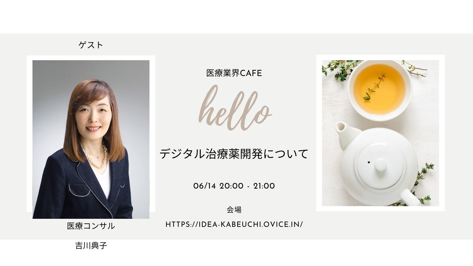 今回はゲストは NPO医工連携推進機構 医工連携コーディネータ協議会会員ご活躍中の 医療コンサルの 吉川典子さん をお呼びしております。デジタル治療薬開発についてお話を伺いたいと思っています。