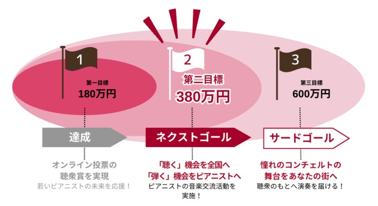 第二目標達成までにいただいたご支援に関しては、「聴く」機会を全国へ・「弾く」機会をピアニストへ届けるべく、全国で開催される入賞者記念コンサートや学校クラスコンサート、海外でのマスタークラスへの派遣といった「ピアニストの音楽交流活動」のために大切に活用させていただきます。