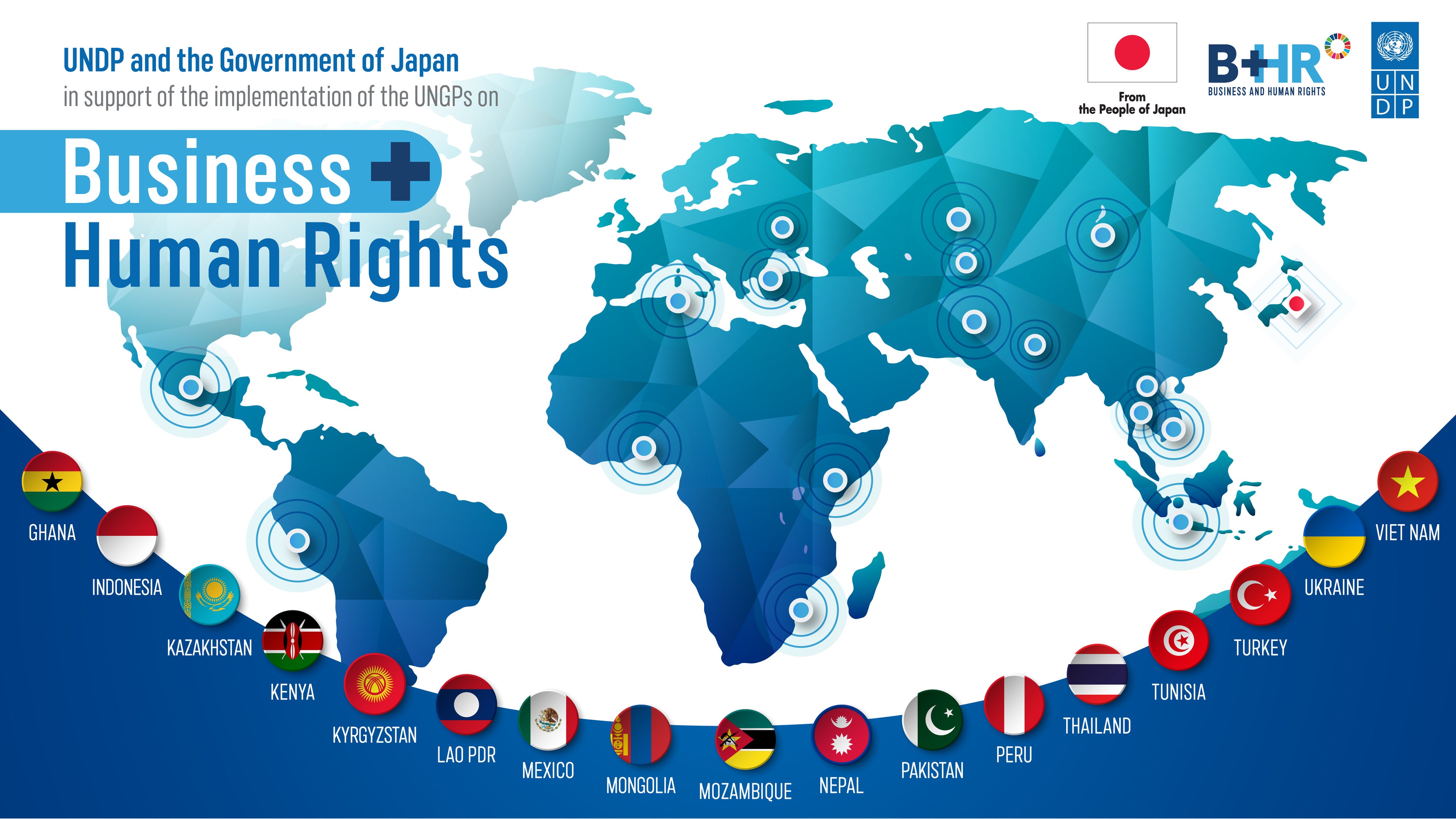 プロジェクトの第二の目的は、17の対象国がビジネス関連の人権侵害に取り組むための政策を策定できるよう、支援することにあります。UNDPは各国政府との連携により、公平な条件を整備し、より多くの企業が責任あるビジネス慣行を受け入れられるようにします。このプロジェクトはガーナ、インドネシア、カザフスタン、ケニア、キルギス 、ラオス、メキシコ、モンゴル、モザンビーク、ネパール、パキスタン、ペルー、タイ、チュニジア、トルコ、ウクライナ、ベトナム各国のUNDP事務所が実施する予定です。日本でも、国内の企業を対象とする研修と指導が行われます。
