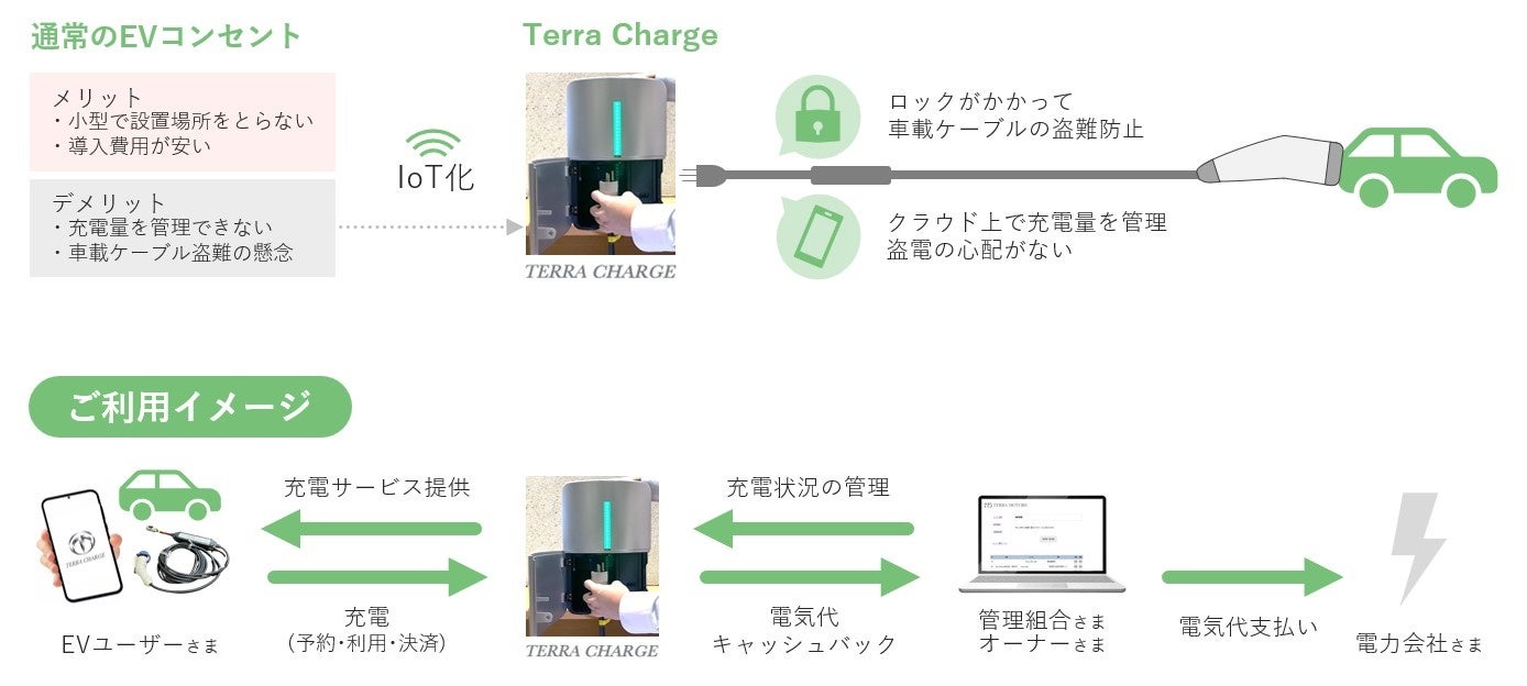 テラモーターズの「Terra Charge」は、日本のEV化を進めるために、特に分譲マンションでの合意形成課題を解決する、初期コスト無料・ランニングコスト無料を実現したEV充電インフラです。「予約・決済・管理」を可能とするソフト面と、「EV充電ケーブルの盗難を防ぐロック機能」などハード面も併せ無料提供し、マンションで導入しやすい、利用がしやすいインフラの提供を実現しています。