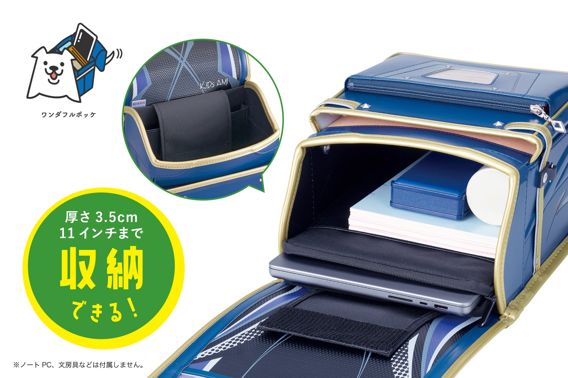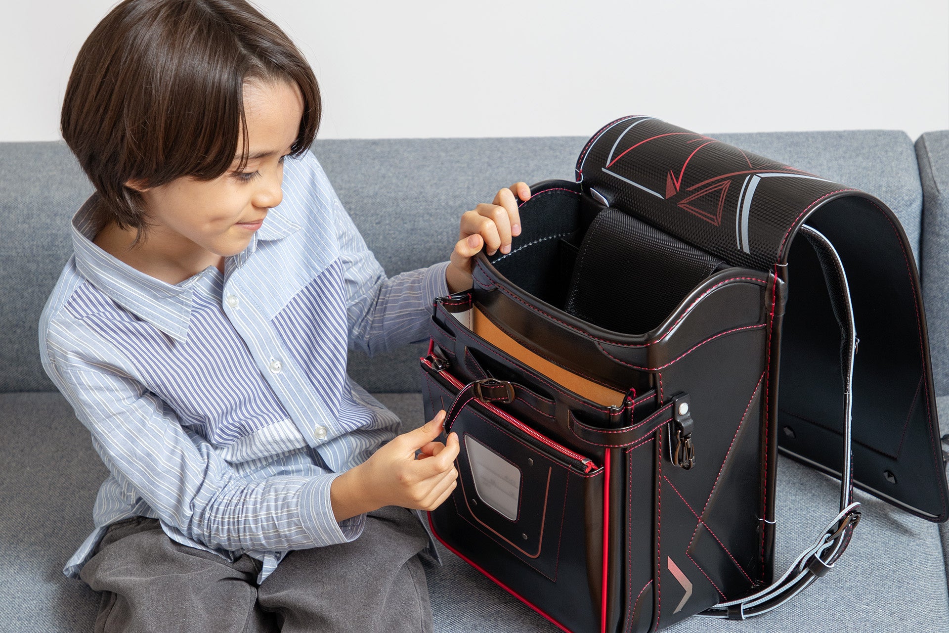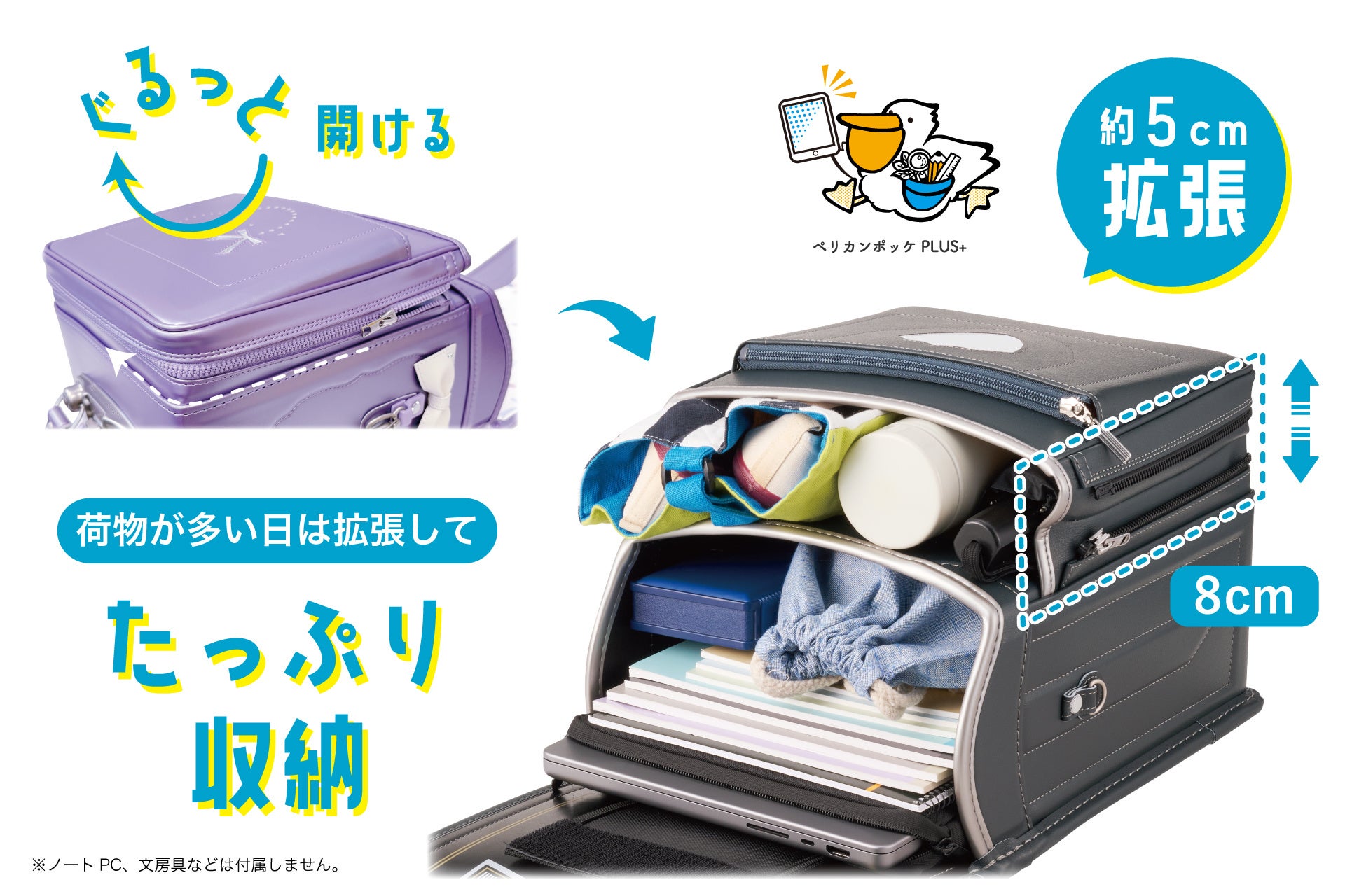 また、数や重さも増している教材や教具に加え、水筒や日傘などの荷物も増えている近年の傾向に対応し、約3cmのポケットが約8cmまで拡張するモデルもご用意いたしました。