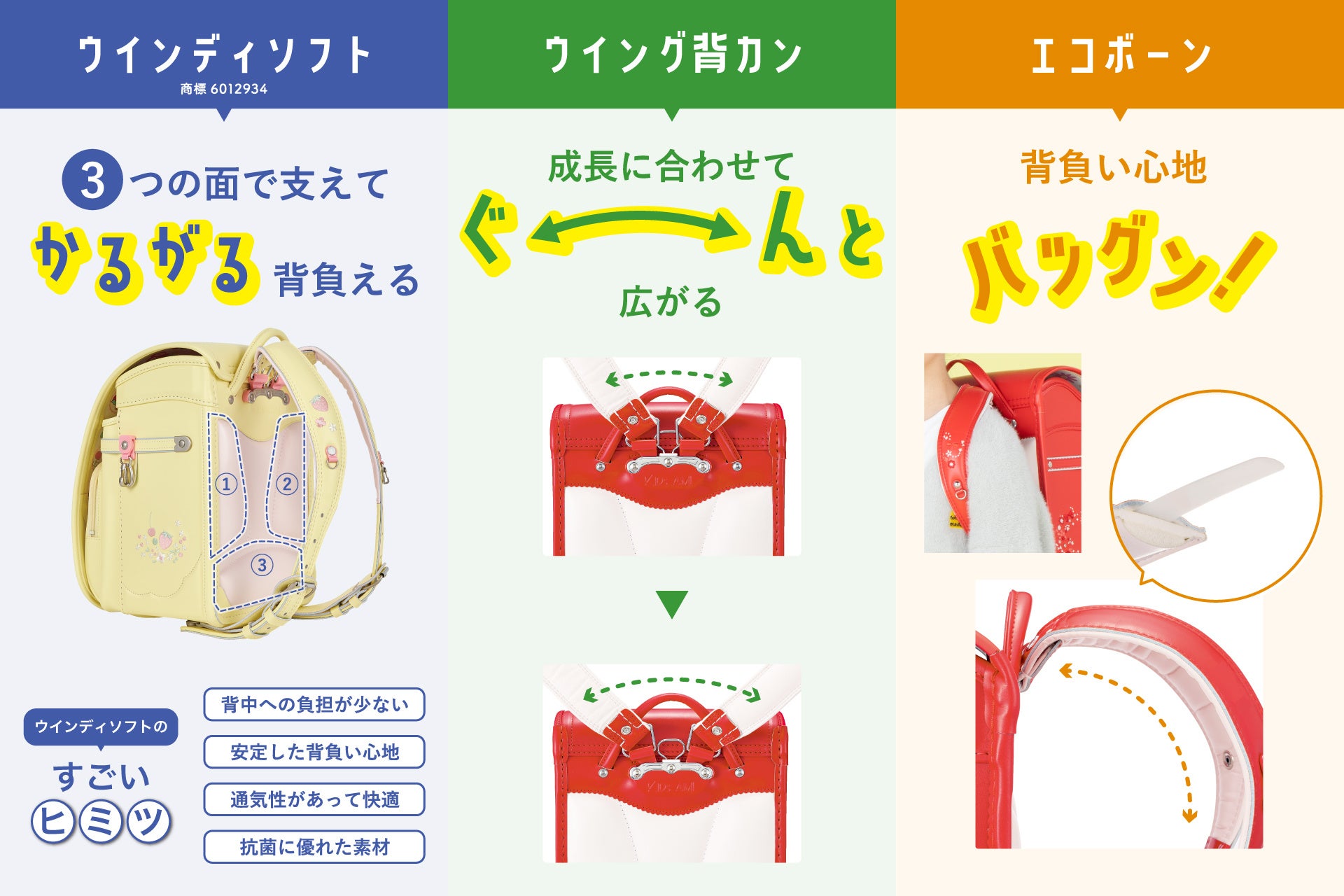 キッズアミランドセルは、3つの面で背中を支える「ウインディソフト」や、背中にぴったりと密着させる「ウイング背カン」、肩が痛くなりにくい「エコボーン」を標準搭載。