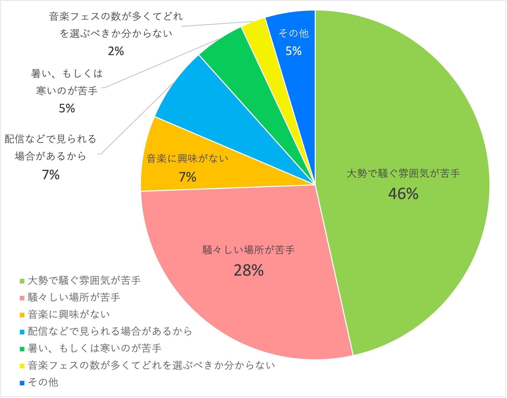 「音楽に興味がない」という意見は7%であった。あくまで音楽は好きだが、空間的に大勢で騒ぐことやガヤガヤとした場所に行くことが好まないという考えから、フェスには参加したくないと考えるようだ。