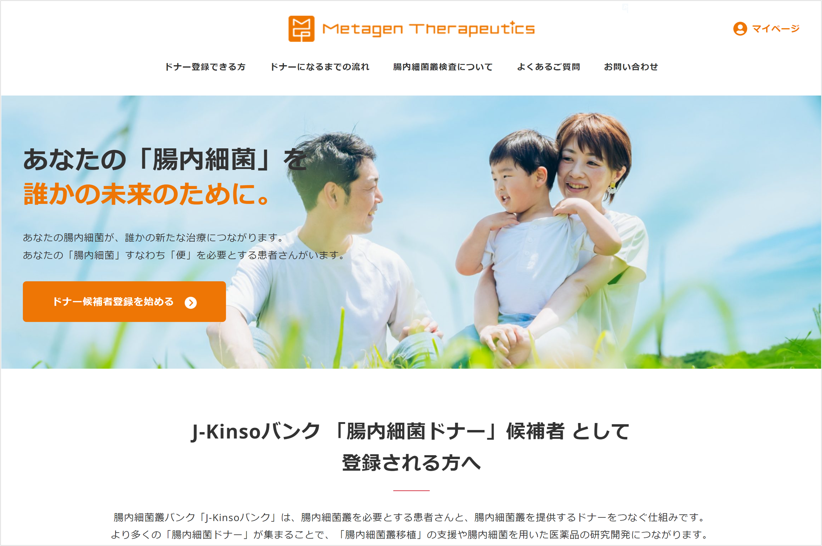 メタジェンセラピューティクスは、2024年4月2日より、「J-Kinsoバンク」における「腸内細菌ドナー候補者」の登録受付を開始しました。登録希望者には、ウェブサイト(https://www.j-kinso-bank.com)にて、ウェブ問診に回答いただき、安全性基準を満たした方を「腸内細菌ドナー候補者」として登録いたします。ドナー候補者のうち、医療機関での適格性検査を通過した方のみ、正式に「腸内細菌ドナー」としての「献便(便の提供)」が可能となります。なお、すべての検査を通過し「腸内細菌ドナー」となる方は、ウェブ問診回答者のうち約10%と推定されています*2。
