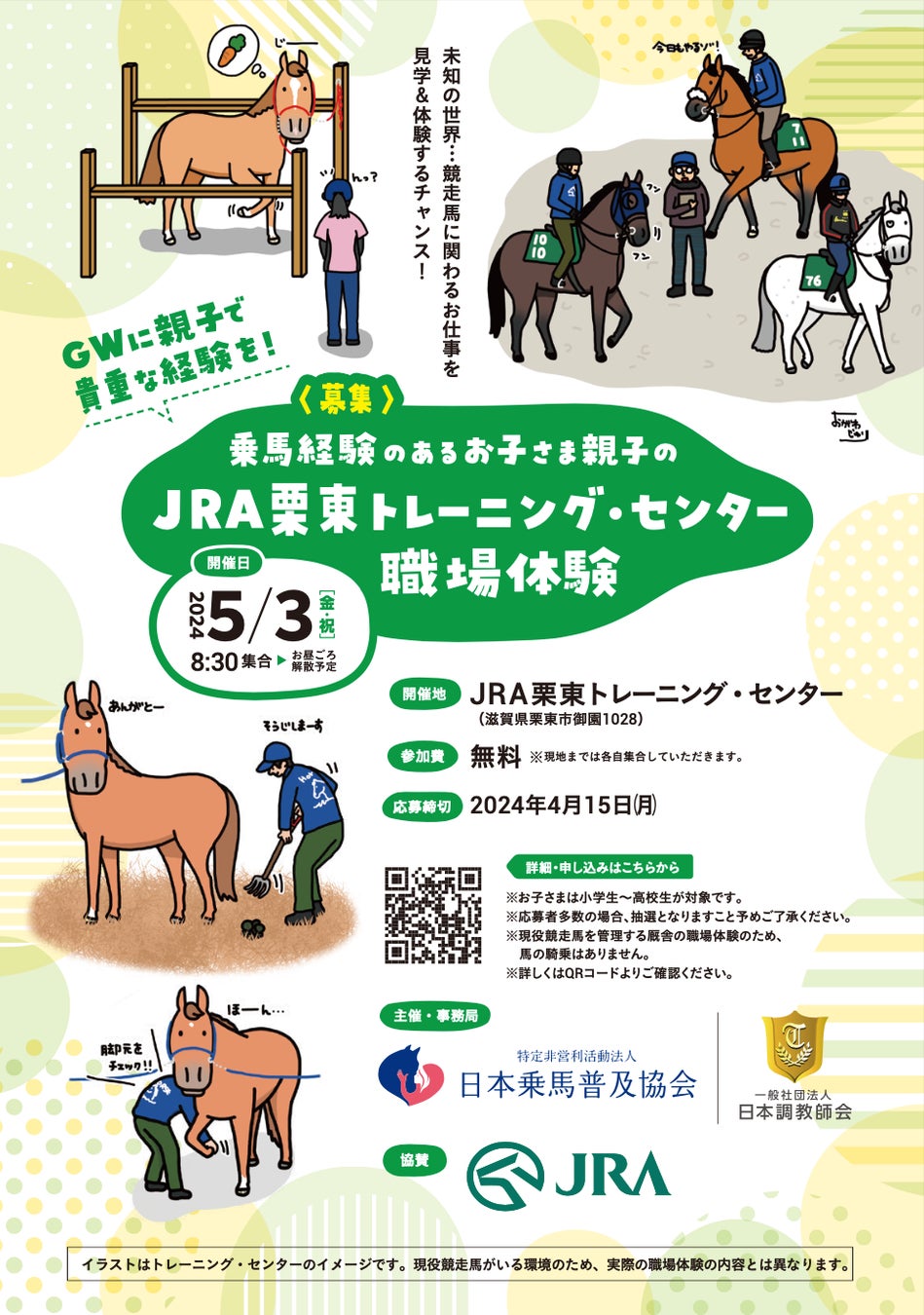 NPO法人日本乗馬普及協会では一般社団法人日本調教師会及びJRA日本中央競馬会の協力のもと、5月3日(金・祝日)にJRA栗東トレーニングセンターで職場体験会を実施いたします。