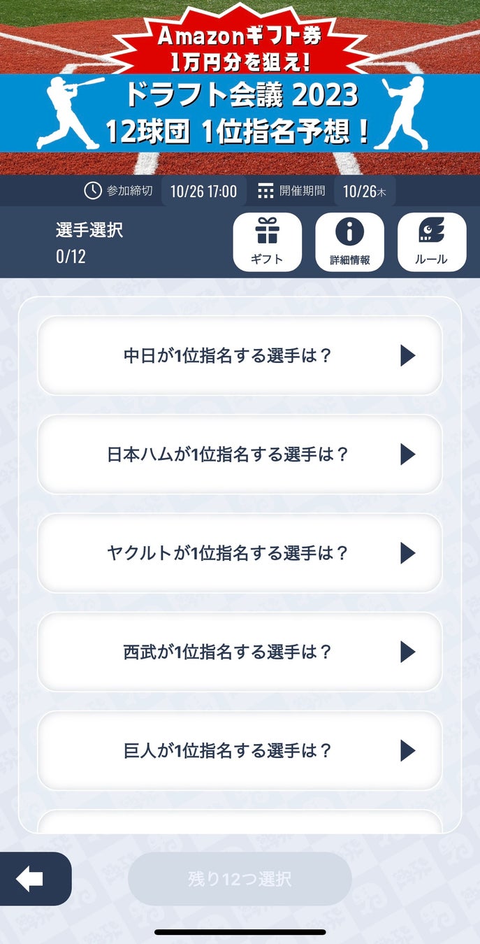 「なんドラ」内で公開されている「12球団1位指名予想」と「注目選手の交渉権獲得予想」の2つの予想で、各球団の1位指名選手や交渉権獲得球団を選択。予想を的中させ、獲得したポイントをもとに参加者のランキングが決まり、ランキング1位〜3位の方には下記のギフトがプレゼントされます。