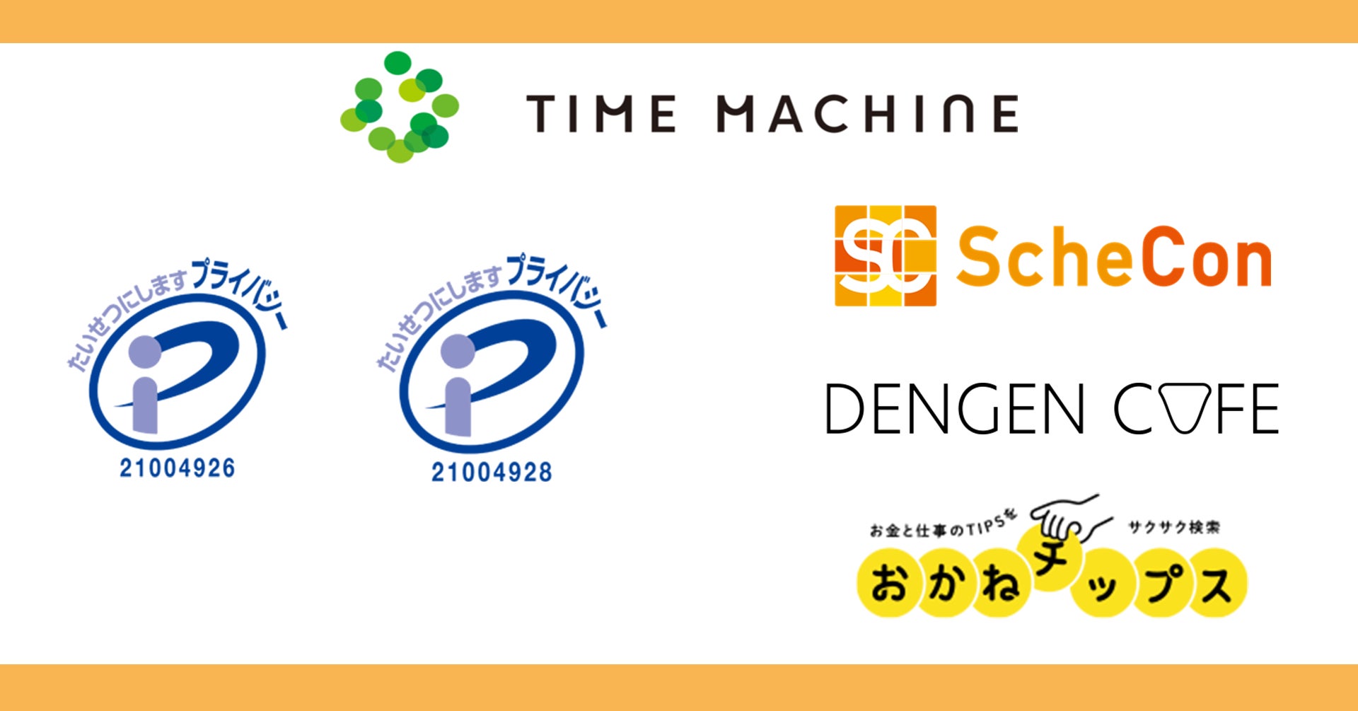 日程調整&オンライン名刺交換サービス「Schecon(スケコン)」や、お金と仕事に関するTipsと求人情報をサクサク検索できる「おかねチップス」を運営する『株式会社TIME MACHINE』(本社:東京都渋谷区、代表取締役社長・CEO:石澤秀次郎/以下、タイムマシーン)、および、グループ会社であり、充電/リモートワークできるカフェ検索サービス「DENGEN CAFE」を運営する『電源カフェ株式会社』(代表取締役:林大勇/以下、電源カフェ)は、一般財団法人日本情報経済社会推進協会より「プライバシーマーク(Pマーク)」の認定を受けたことをお知らせいたします。