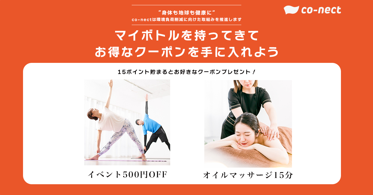 肩こり腰痛等の不調改善から、より日常生活が快適になるための疲れにくいカラダ作りまでをサポートする「ボディメンテナンス」を提供する「co-nect」(運営会社:株式会社co-nect、 東京都新宿区、代表取締役:中山友貴)は、省資源の取組みとして『紙コップ削減キャンペーン』を開催します。マイボトルを持参の方にco-nectで使えるお得なクーポンをプレゼントします。