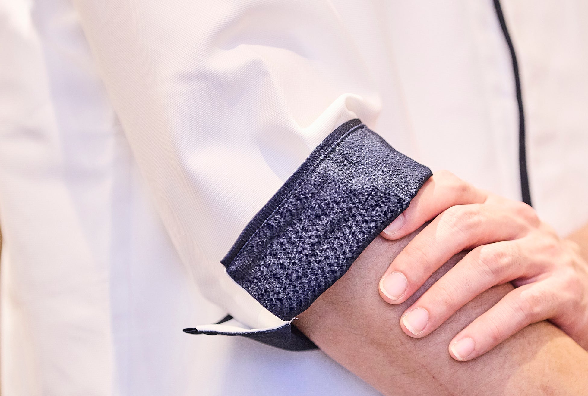 新ユニフォームは、伝統と技を受け継ぐ料理人の誇りを表現するとともに、立ち襟や直線的なパイピングによって凛とした姿勢と清潔感を引き立てます。襟裏・袖裏には配色生地を取り入れ、見た目のアクセントと汚れにくさを両立。柔らかさとハリを持つオックスフォード生地が美しいシルエットを保ち、スナップボタンで異物混入を防いで安全性にも配慮しました。