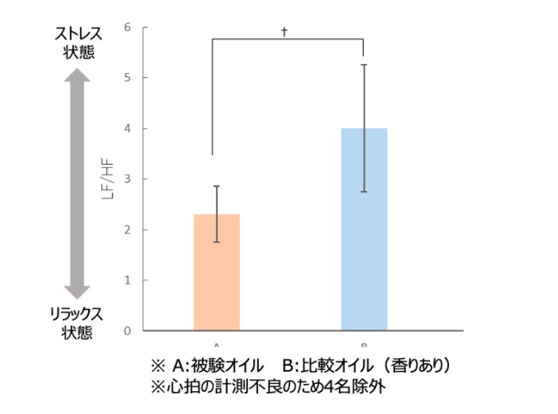 さらに自律神経機能のバランスを表す、心拍によるストレス指標(LF/HF)では、A:被験オイル(アクアナイト オイル)香り(香料)とB:比較オイル香り(香料)を比較すると、比較オイルと比べて、Aqua Night (アクアナイト)の方がリラックス状態に導く可能性が示されました。【図2】