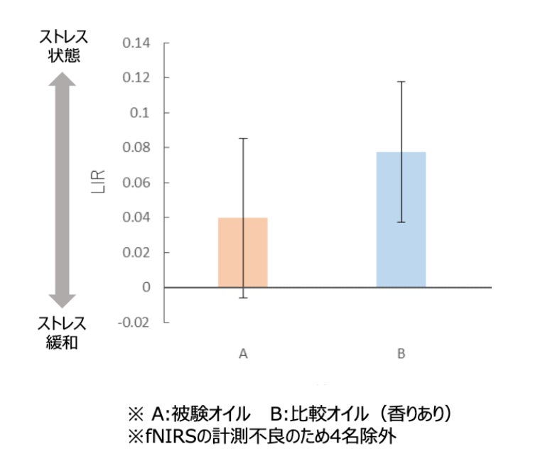 A:被験オイル(アクアナイト オイル)、B:比較オイル(香りあり)を使用し、それぞれのストレス脳指標を比較したfNIRS調査では、比較オイル(香りあり)よりも Aqua Night (アクアナイト)の方がストレス緩和が見受けられました。【図1】