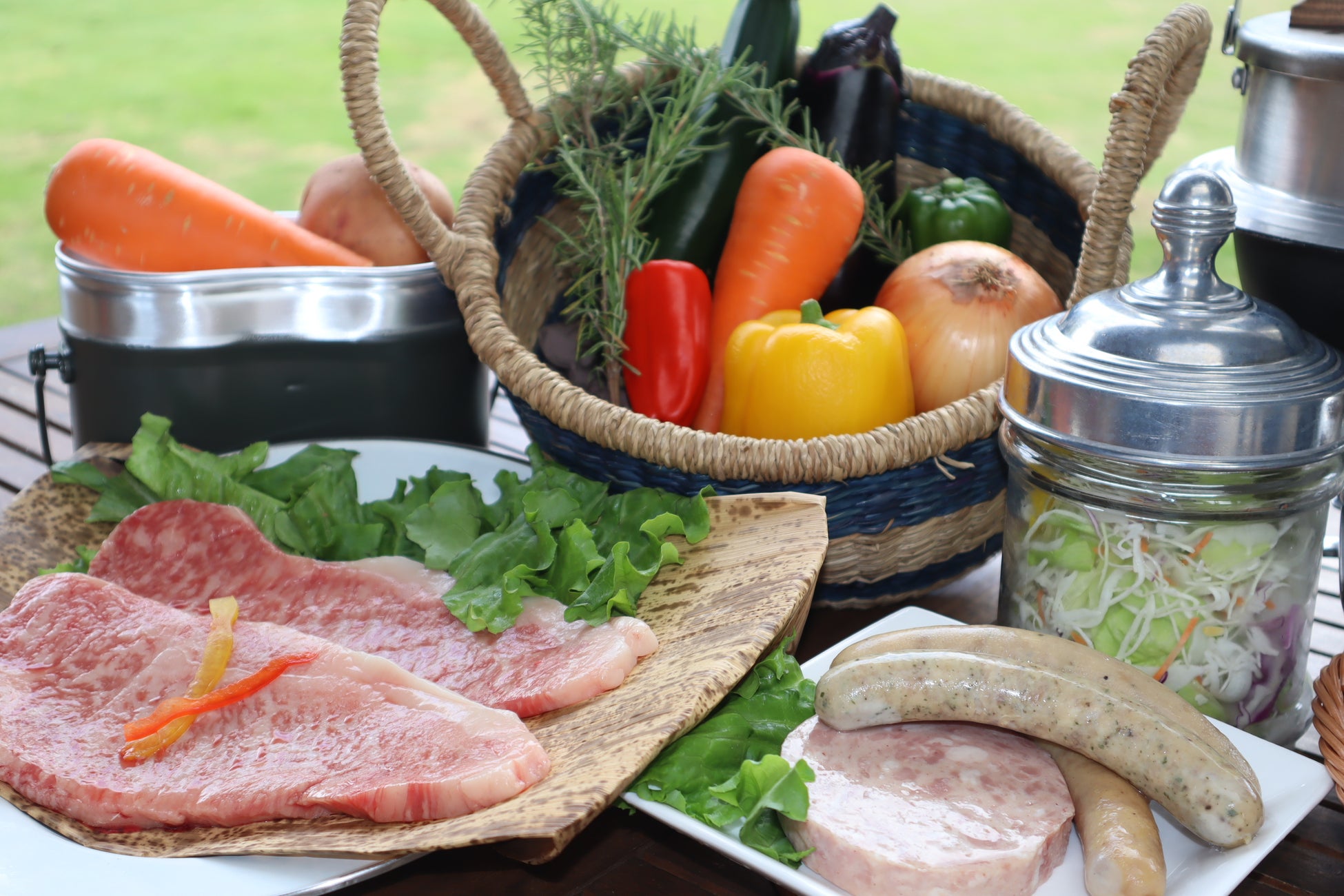 ・夕食:贅沢滞在BBQ(ハム&ソーセージ、常陸牛サーロイン、旬の地野菜、飯ごうで作る野菜たっぷりポトフ、やさとのお米のご飯、サラダ、季節のくだもの)