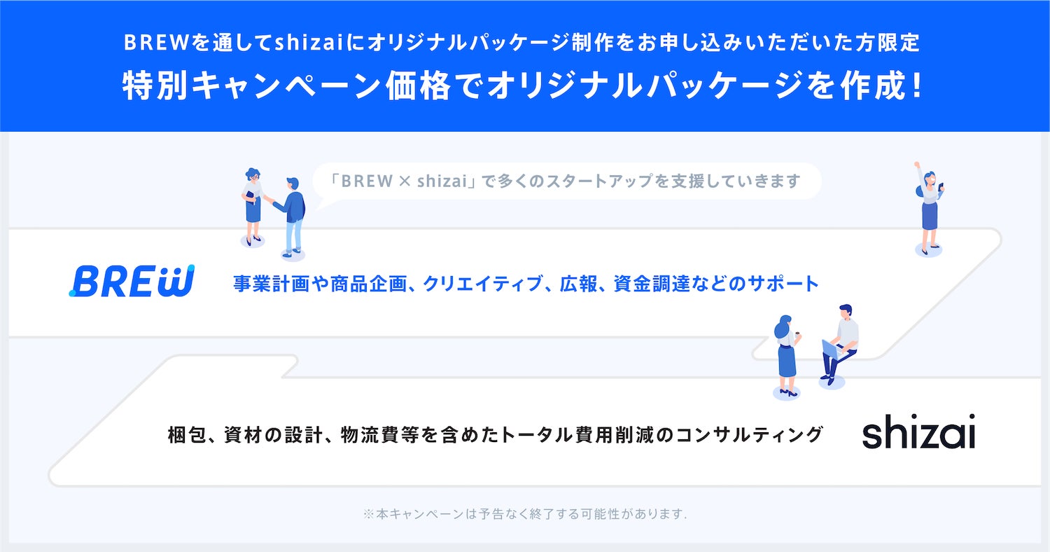 本提携により、shizaiによる事業に最適なオリジナルパッケージ制作を通して効率的なバックエンド業務実現の支援と、BREWの持つ経営コンサルティングやデザイン制作・広報PRなどの事業クリエイティブ力によって、商品企画段階でも、サービスリニューアル段階でも、スタートアップ企業の事業成長を両社でサポートしていきます。