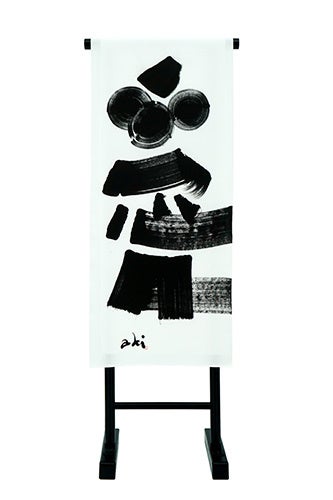 絹本には墨を、スカーフには染料を用い、正絹の質感を生かしながら、書の力強さと繊細さをあわせ持つ作品に仕上がっています。