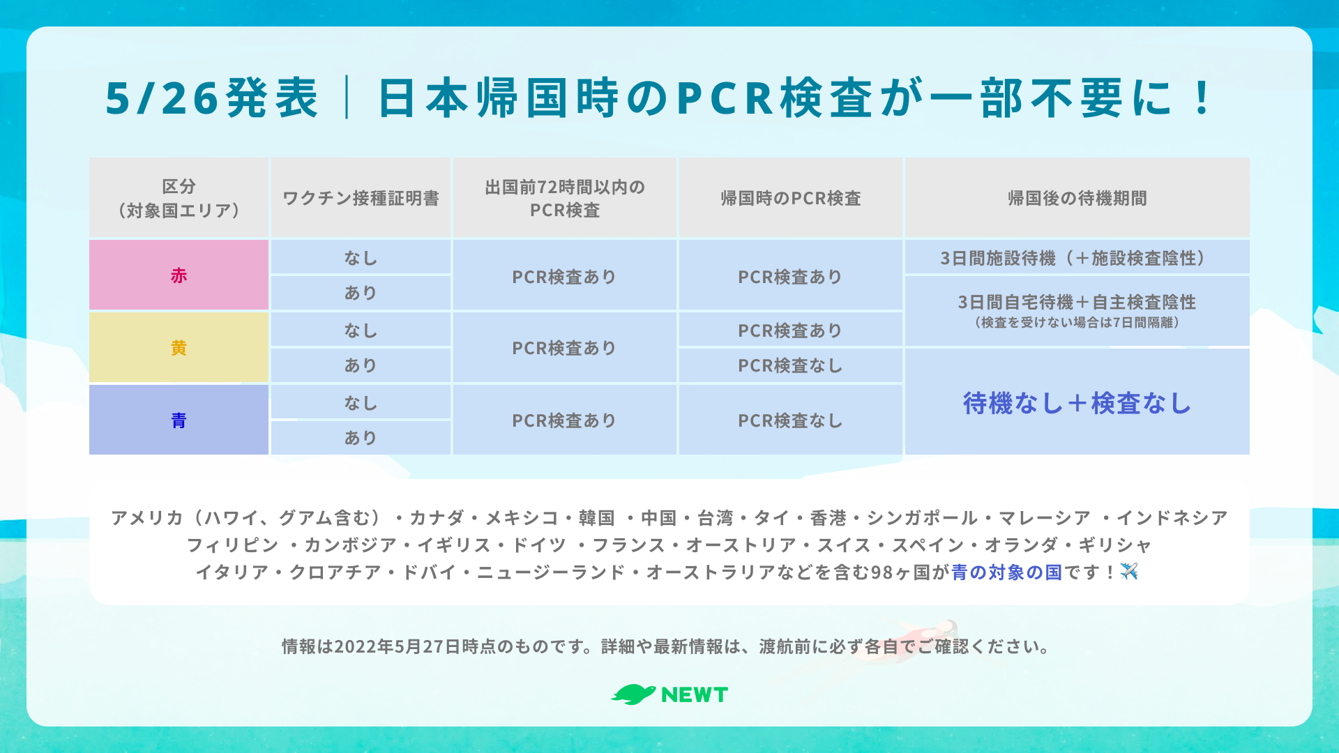 そして、さらなる水際対策の緩和が発表され、2022年6月1日から下記「青」区分に該当する98の国と地域は、今まで入国・帰国時に行っていた入国時検査と自宅待機を、ワクチン3回目接種の有無に関わらず実施されないこととなりました。*2