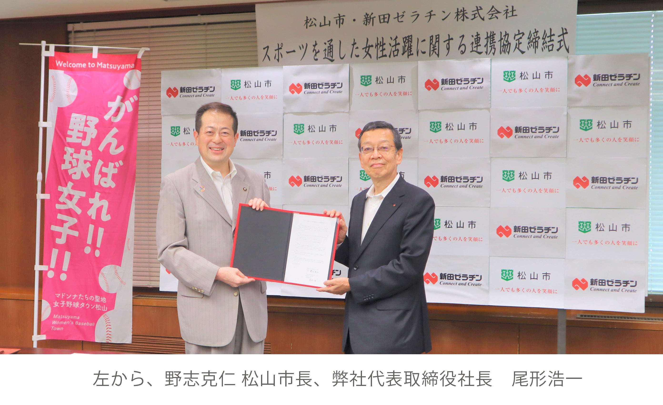 弊社は創業100周年を迎えたことを機に、創業者新田長次郎の生誕の地・松山に恩返しをしたいと考え、コラーゲンペプチド製品を愛媛FCレディースや、松山大学女子駅伝部などに提供し、「松山で活躍する女子アスリート」を応援する活動を「松山プロジェクト」と名付け、2020年から続けてきました。更にこの「松山プロジェクト」の活動を広げようとするタイミングで、松山市の女子野球への取組みを知りました。「女子アスリート支援により松山市を盛り上げたい」という両者の思いが重なったことから、今回の連携協定締結に至りました。