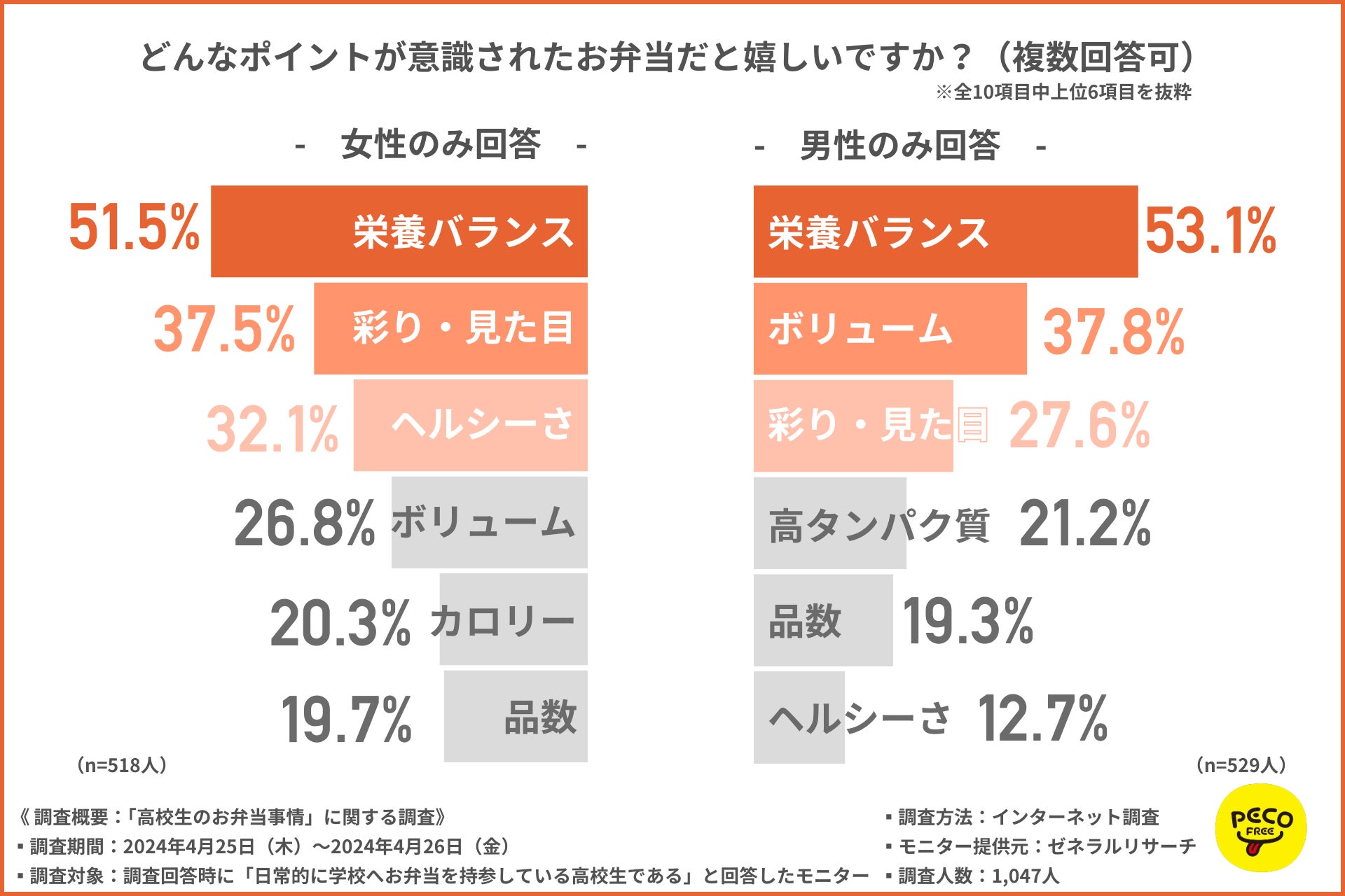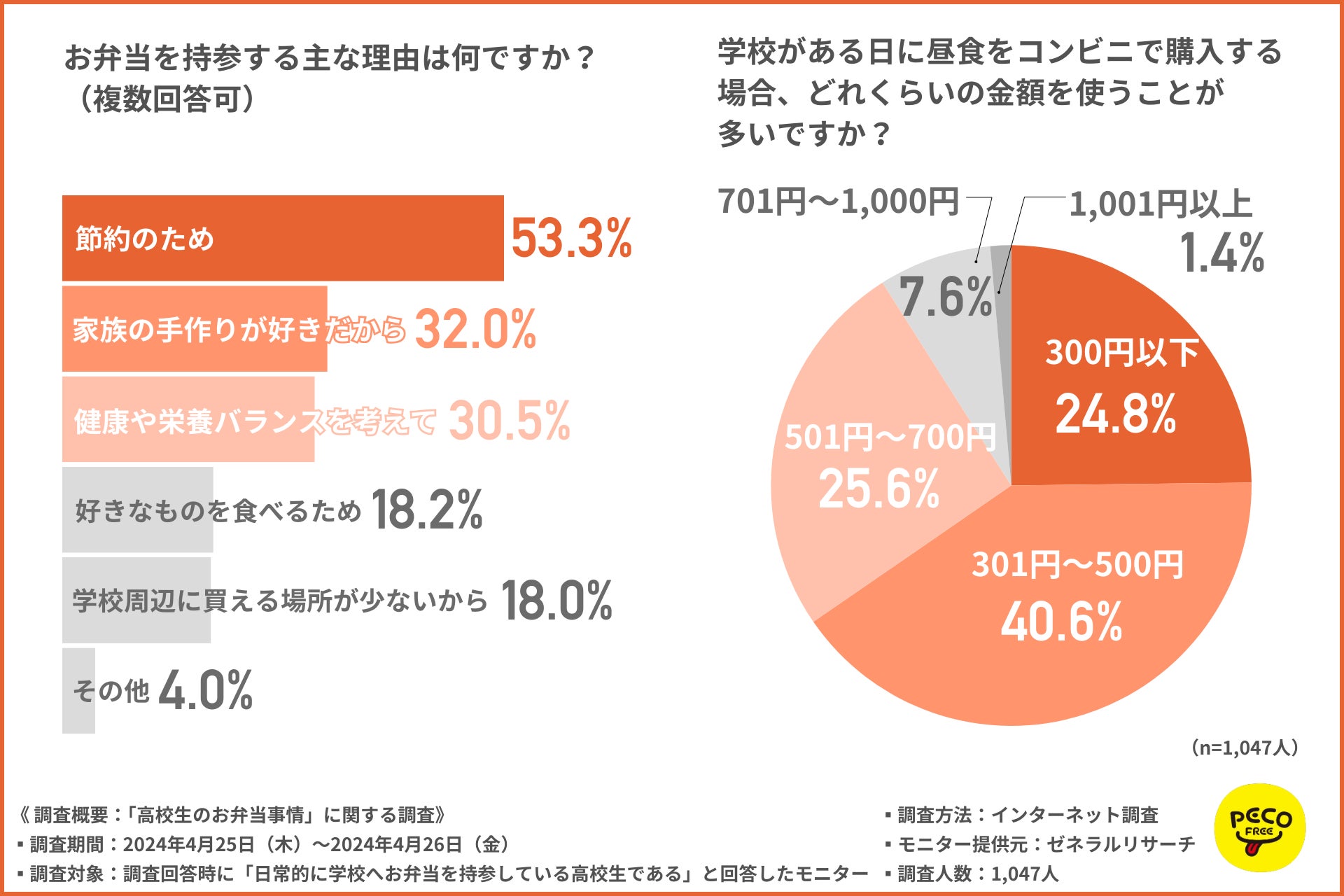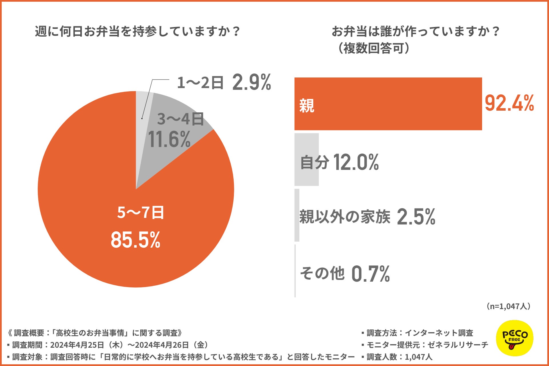 株式会社PECOFREE(本社:福岡県、代表取締役:川浪 達雄)は、日常的に学校へお弁当を持参している高校生を対象に、「高校生のお弁当事情」に関する調査を実施しました。