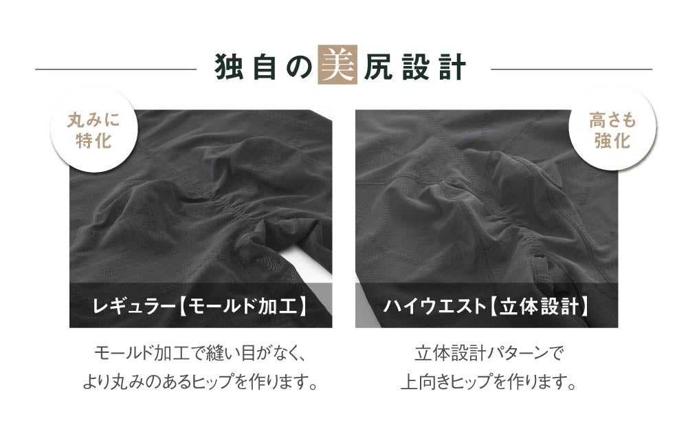 ヒップの部分は、独自の美尻設計。レギュラータイプでは、お尻部分に縫い目のないヒップモールド加工を採用、身生地と裏打ちの「面」で集肉、より丸みのあるヒップを作ります。ハイウエストタイプは立体設計で、高さと丸みがあるヒップにととのえます。