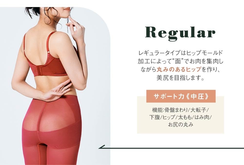 タイプは「お尻も気持ちも上向き」レギュラータイプと「あばらを締めて神くびれ」ハイウエストタイプの2種類。