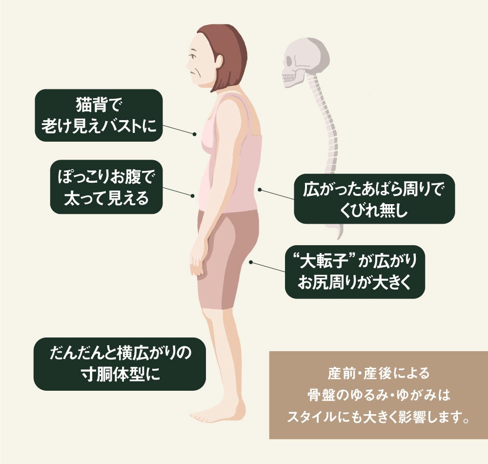 生活習慣や年齢、スマートフォンやコロナ禍でのリモートワークで姿勢が悪くなるなど、知らず知らずのうちに進む体形変化。姿勢が悪くなると、ぽっこりお腹や骨盤が緩んでお尻が大きく見えたり、くびれがなくなったり、体全体が崩れる大きな要因になります。
