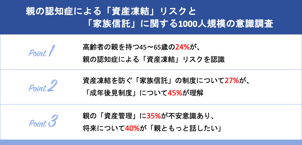 45〜65歳の4人に1人が、親の認知症による「資産凍結」リスクを認識。資産凍結を回避する「成年後見制度」を45%、「家族信託」を27%が理解。親の資産管理について3人に1人が不安意識あり