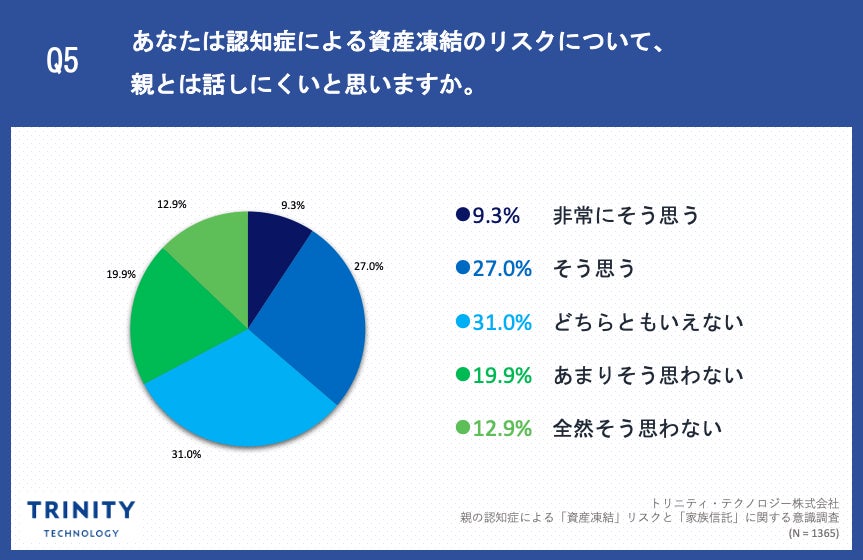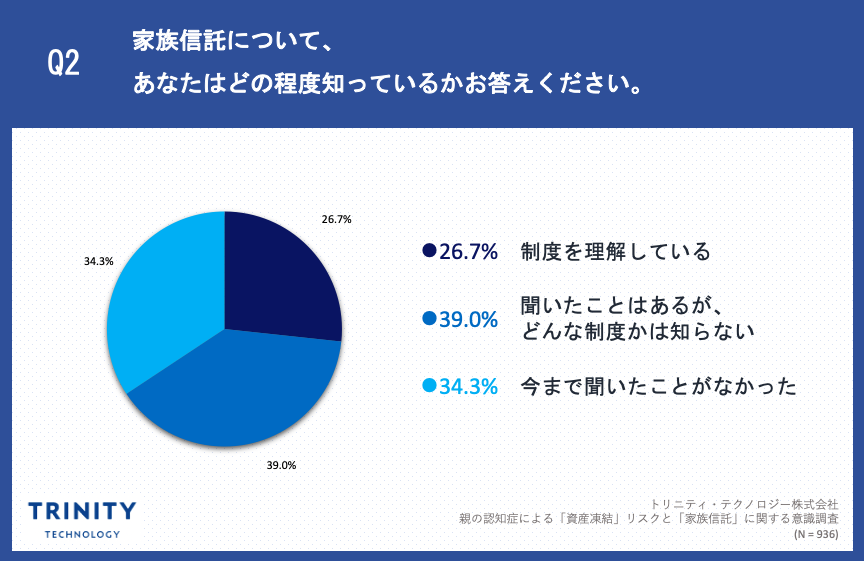 「スマート家族信託」(https://sma-shin.com/)を運営するトリニティ・テクノロジー株式会社(所在地:東京都港区、代表取締役:磨和寛、以下トリニティ・テクノロジー)は、2000万円以上の金融資産を保有している親を持つ45歳〜65歳の男女約1000名を対象に、親の認知症による「資産凍結」リスクとその解決策である「家族信託」に関する意識調査を実施いたしましたので、お知らせいたします。