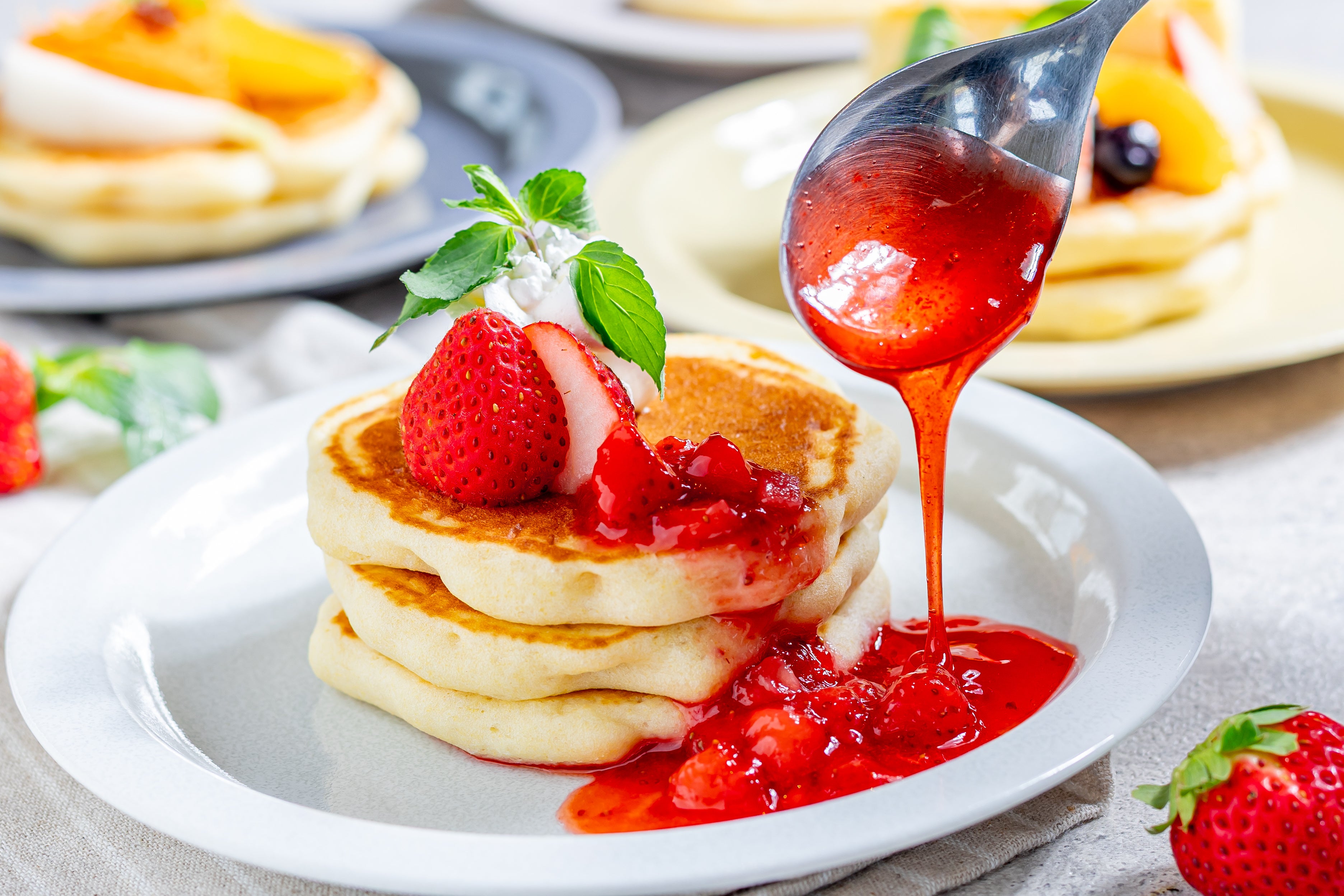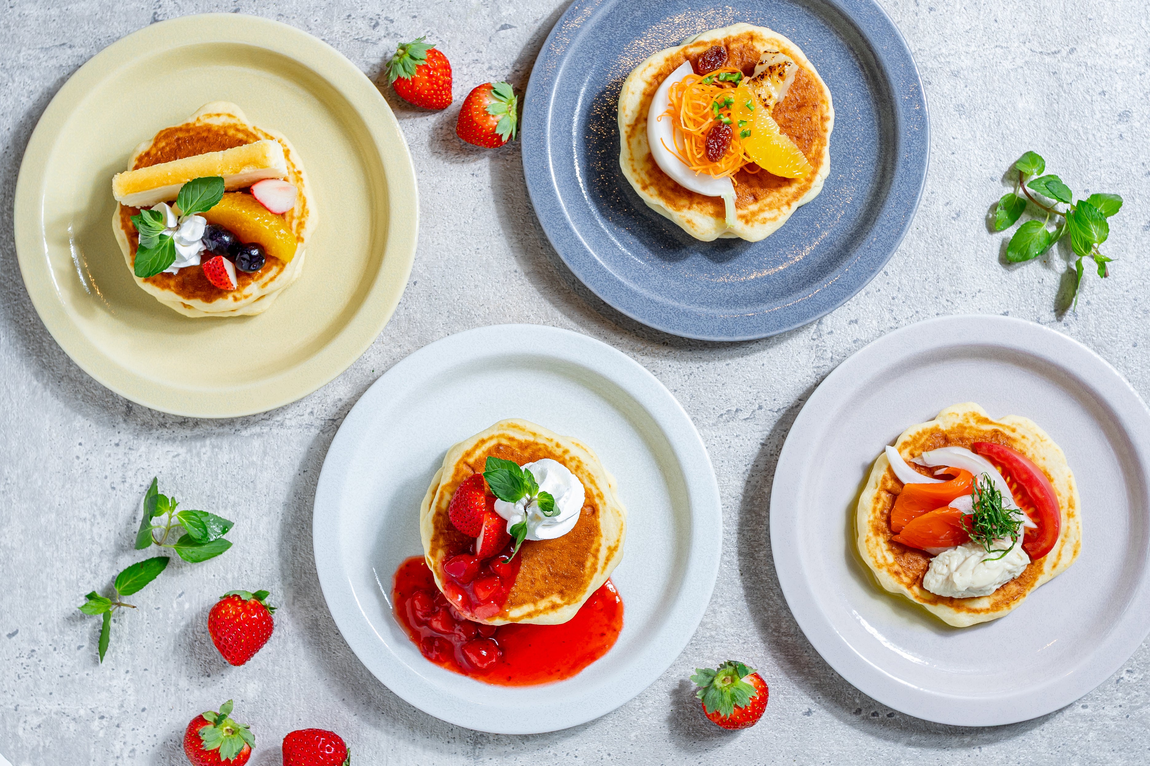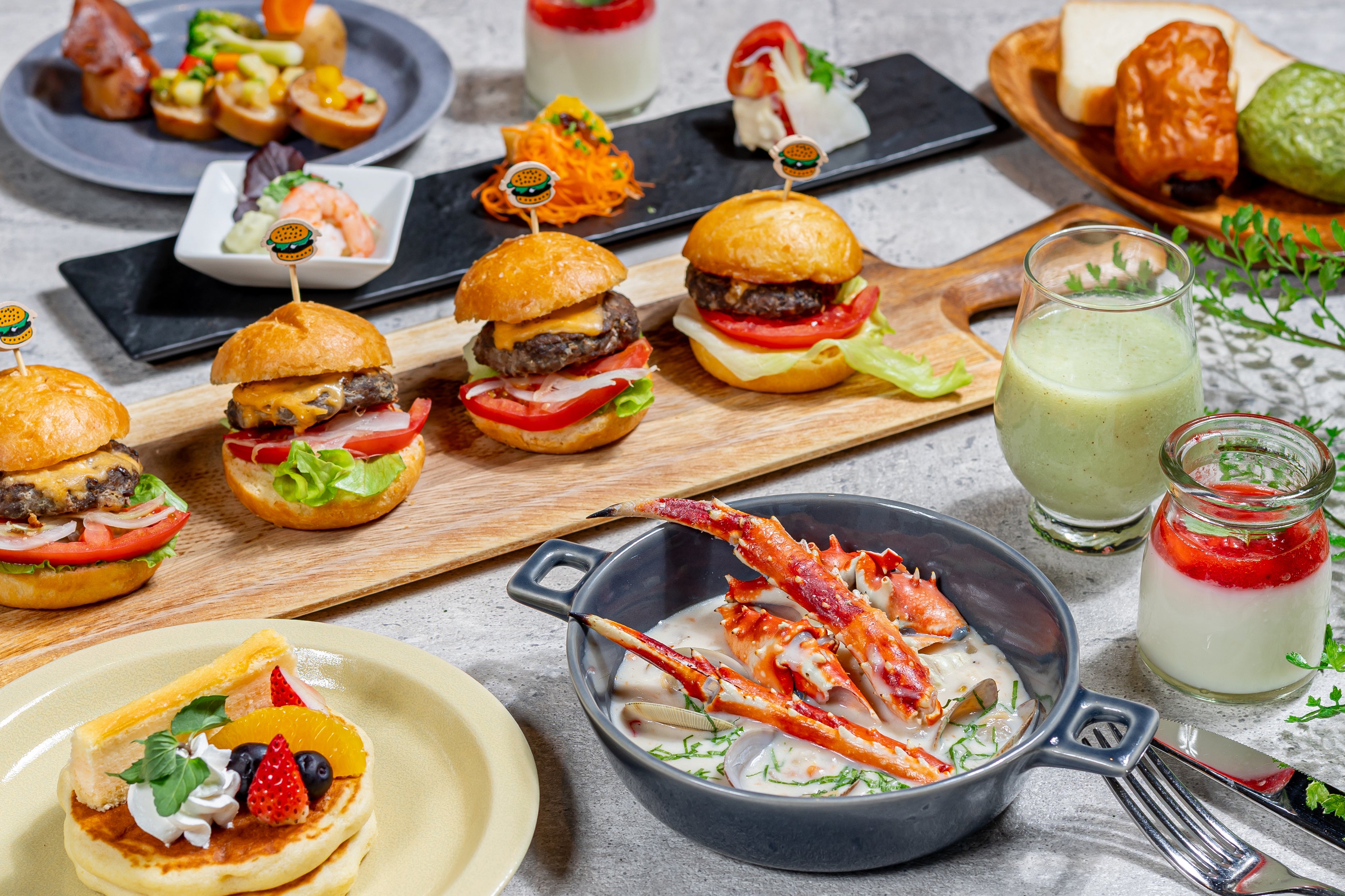 濃厚で質の高い生乳から作られる、函館牛乳の自家製プリンや、北海道アイスクリーム、北海道チーズケーキをお楽しみいただけます。また、焼きたてのパンケーキにビュッフェに並ぶ料理やクリームやペーストをトッピング!
