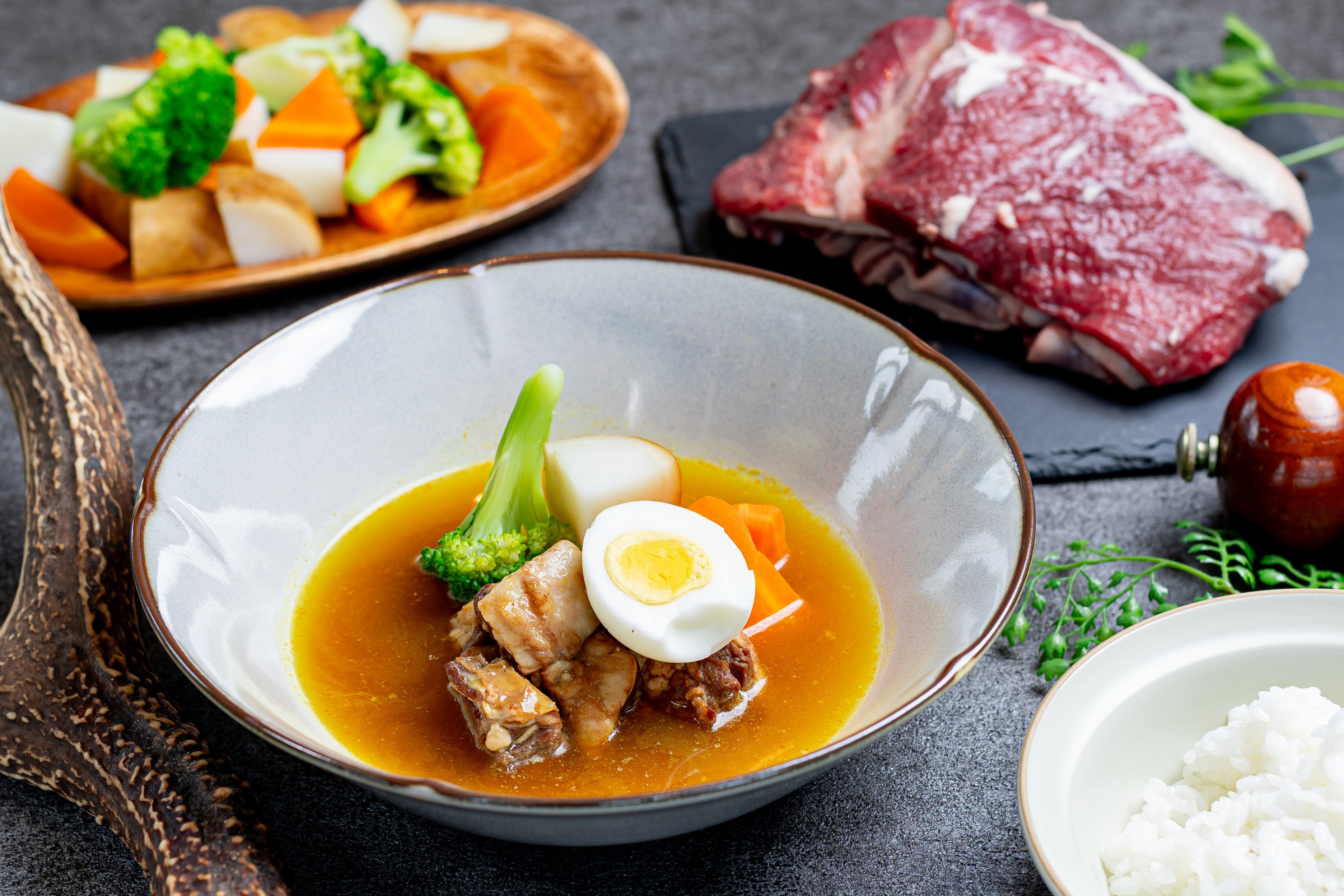 ・北海道発祥のスープカレーに鹿肉をアレンジ、上品な肉質で驚くほど柔らかく、とろけるような食感の函鹿スープカレーもおすすめです。