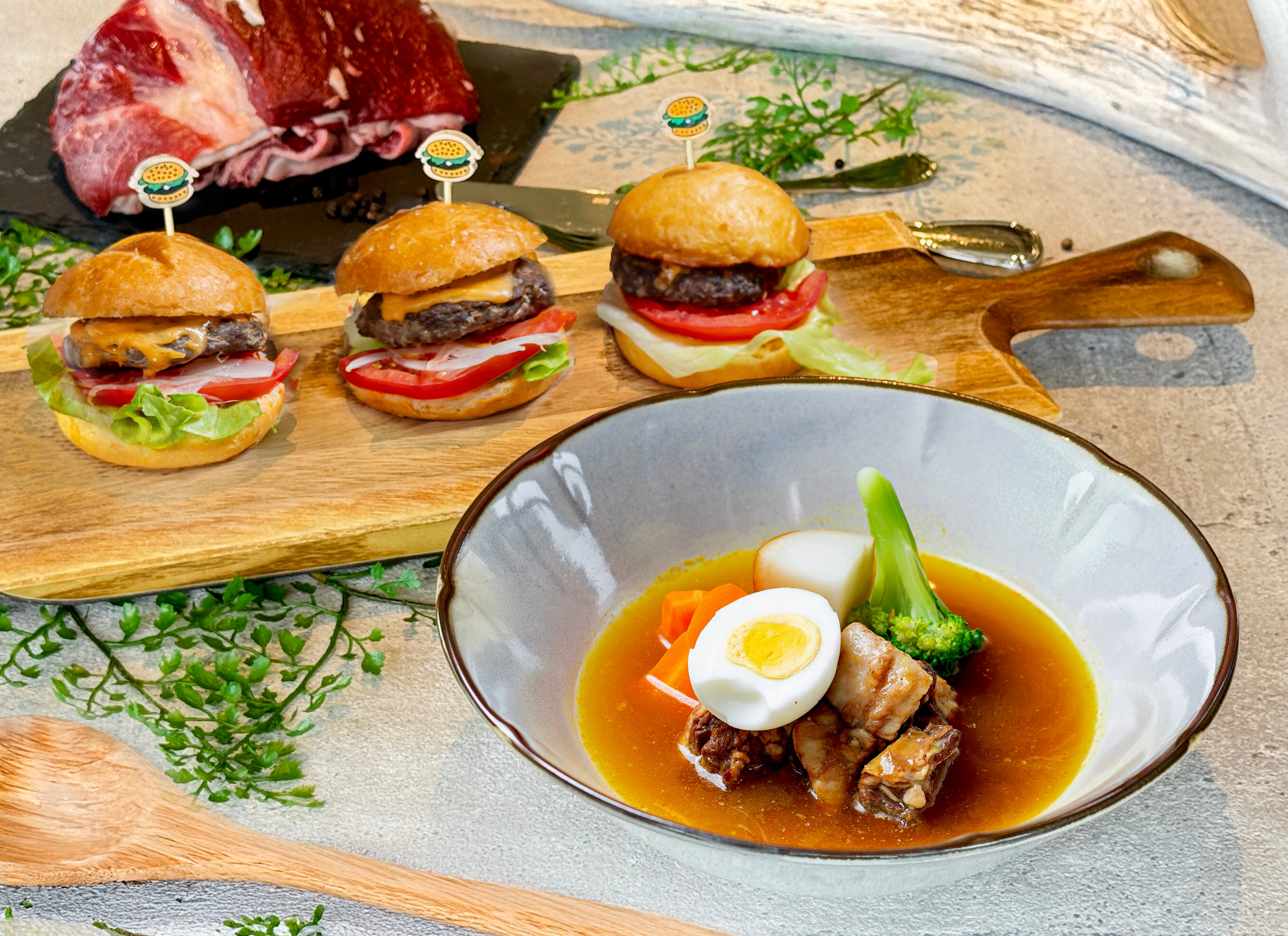 ・ヘルシーで栄養価に優れた鹿肉を、目の前の鉄板で調理した焼きたてのパティを挟んだハンバーガーを提供します。目覚めた身体にパワーを注入!朝から五感を刺激する焼きたて料理をご堪能ください。チーズとの相性も抜群です。