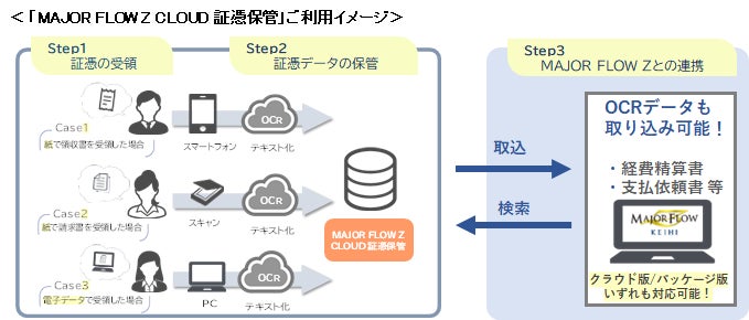 「MAJOR FLOW Z CLOUD 証憑保管」は、スマートフォン・スキャナで読み取った領収書や請求書などのデータ、電子取引で受領した電子データをクラウドにアップロードして保管・管理するサービスです。