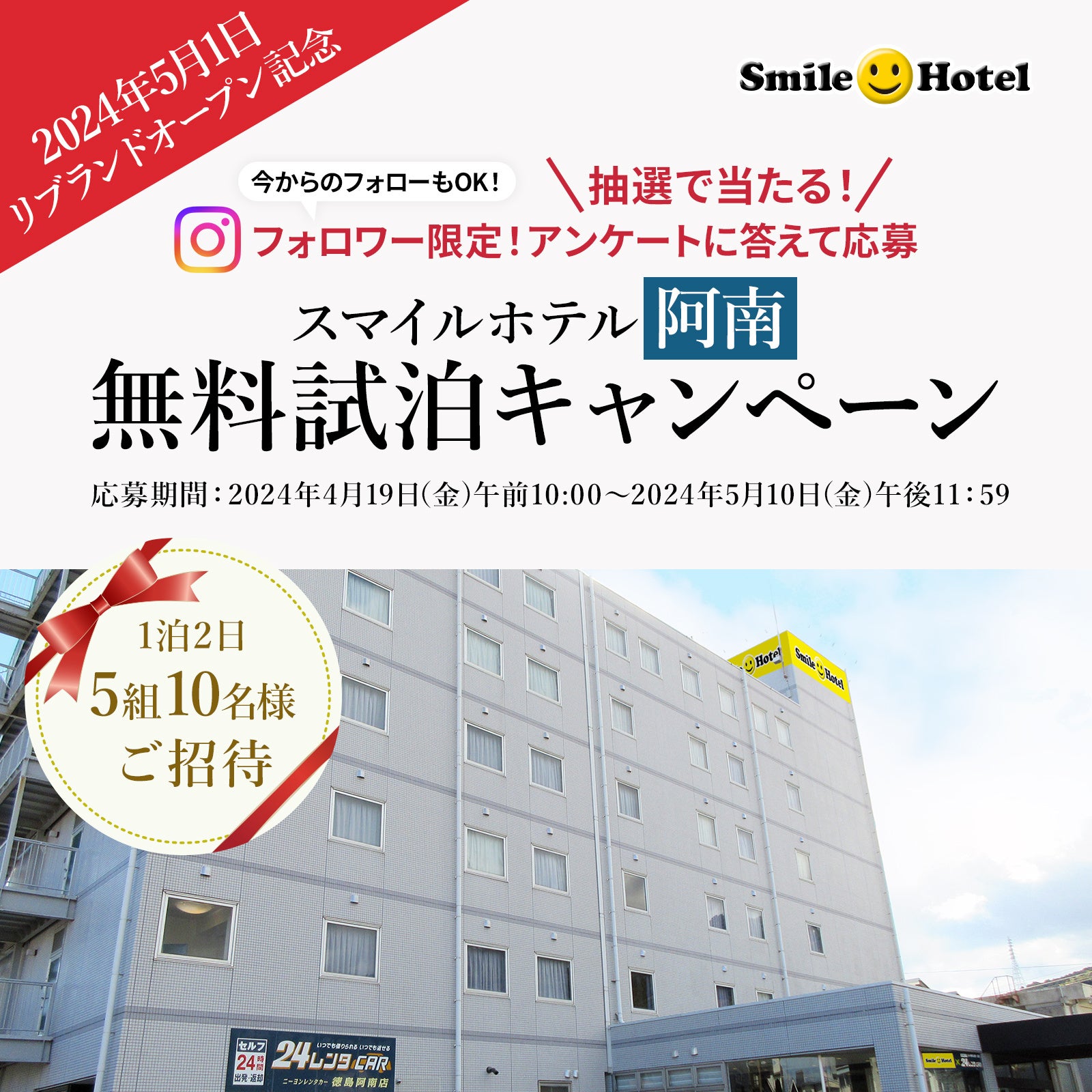 ◆応募条件:スマイルホテル公式Instagram(@smilehotels)を『フォロー』+簡単な『アンケート』に回答